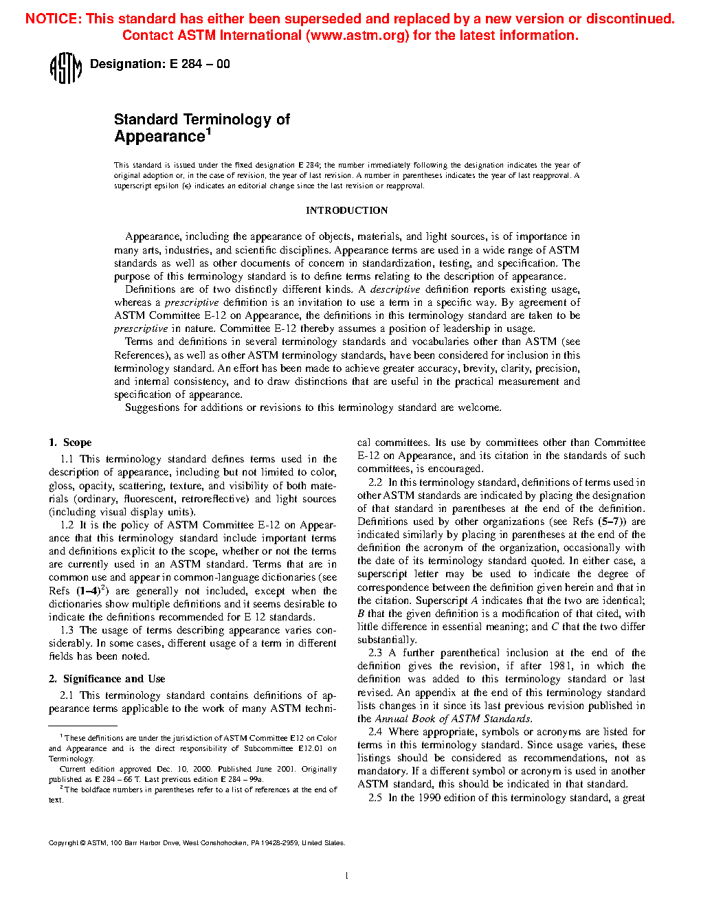 1.1 This terminology standard defines terms used in the description of appearance, including but not limited to color, gloss, opacity, scattering, texture, and visibility of both materials (ordinary, fluorescent, retroreflective) and light sources (including visual display units).