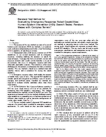 1.1 This test method is intended for remotely operated ground robots operating in complex, unstructured, and often hazardous environments. It specifies the apparatuses, procedures, and performance metrics necessary to measure the capability of a robot to maneuver and search throughout an environment to inspect objects of interest while negotiating complex terrain. This test method is one of several related human-system interaction tests that can be used to evaluate overall system capabilities.