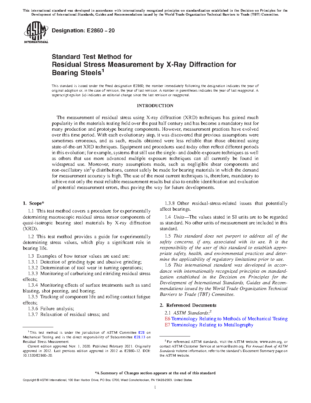 1.1 This test method covers a procedure for experimentally determining macroscopic residual stress tensor components of quasi-isotropic bearing steel materials by X-ray diffraction (XRD).