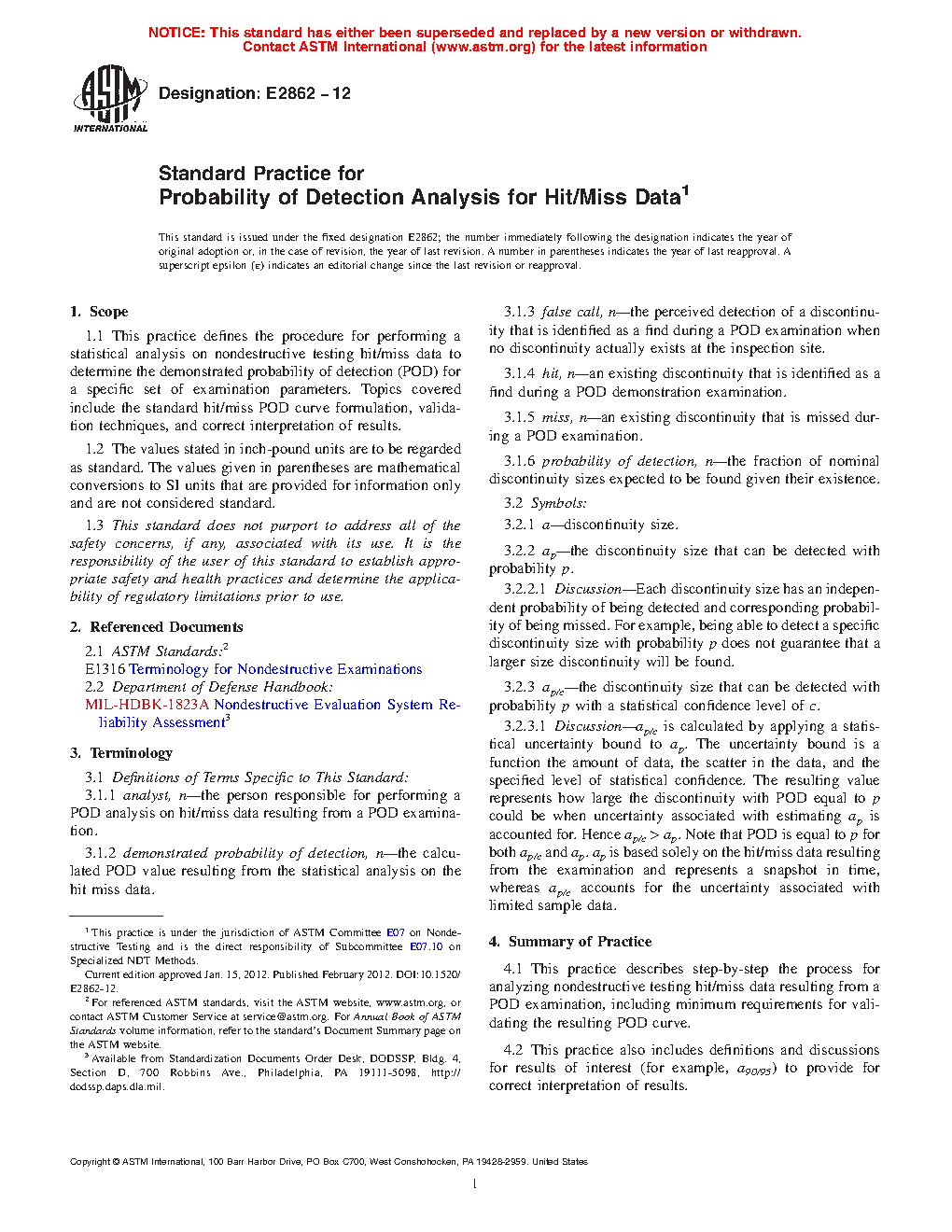 1.1 This practice defines the procedure for performing a statistical analysis on nondestructive testing hit/miss data to determine the demonstrated probability of detection (POD) for a specific set of examination parameters. Topics covered include the standard hit/miss POD curve formulation, validation techniques, and correct interpretation of results.