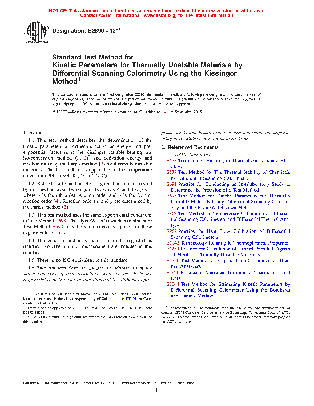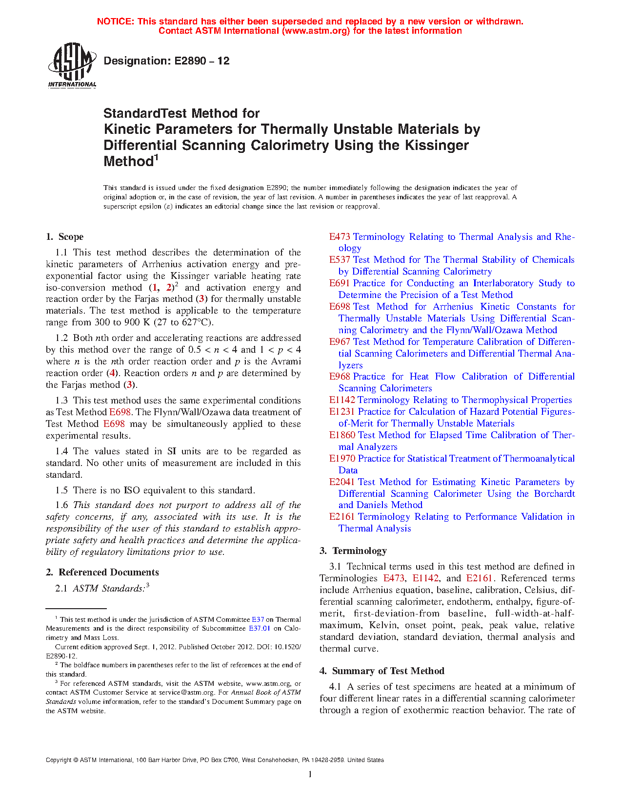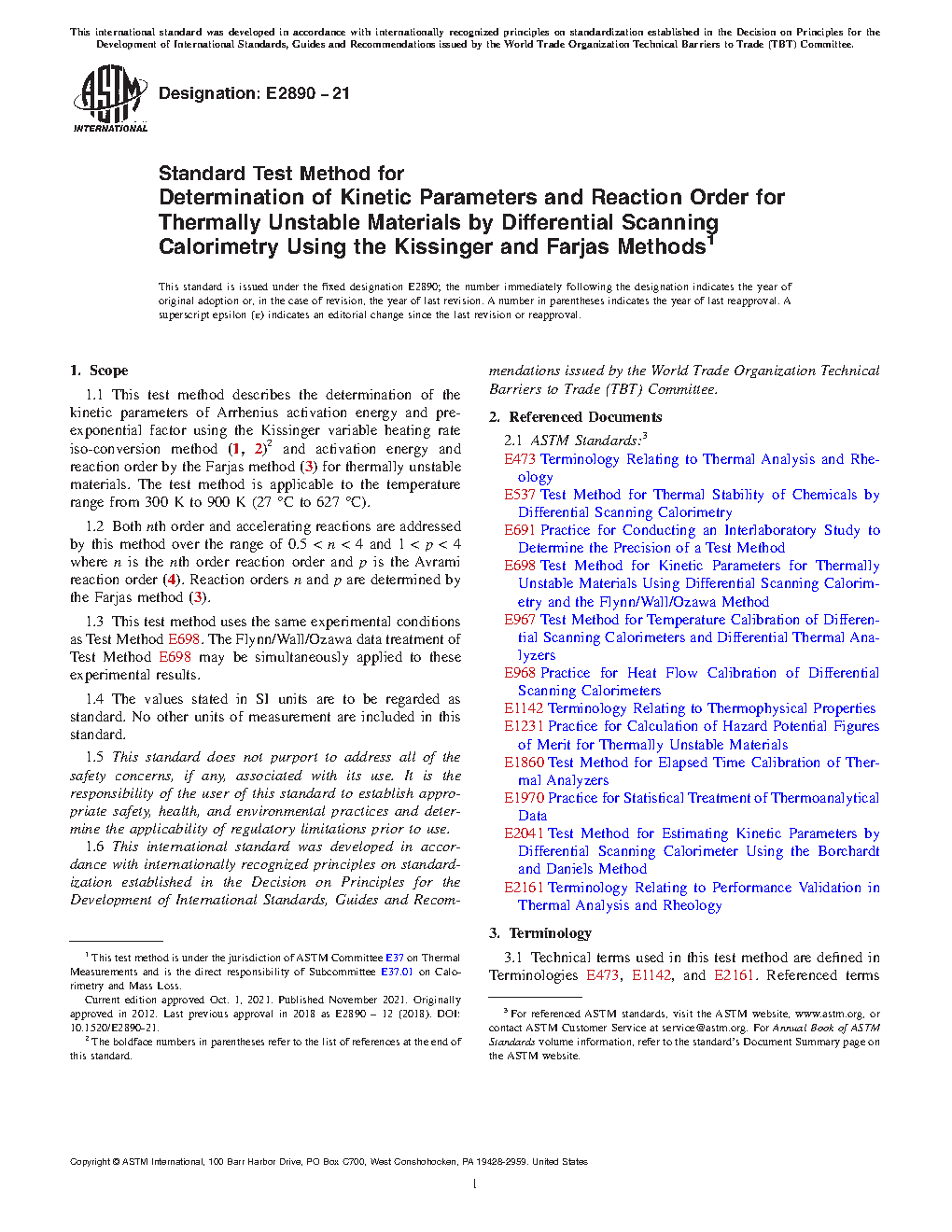1.1 This test method describes the determination of the kinetic parameters of Arrhenius activation energy and pre-exponential factor using the Kissinger variable heating rate iso-conversion method (1, 2)2 and activation energy and reaction order by the Farjas method (3) for thermally unstable materials. The test method is applicable to the temperature range from 300 to 900 K (27 to 627°C).