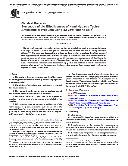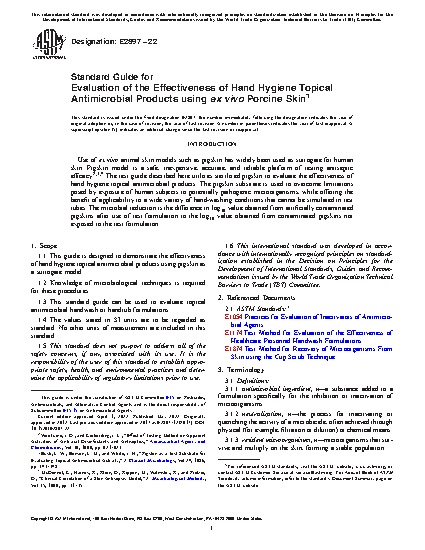 1.1 This guide is designed to demonstrate the effectiveness of hand hygiene topical antimicrobial products using pigskin as a surrogate model.