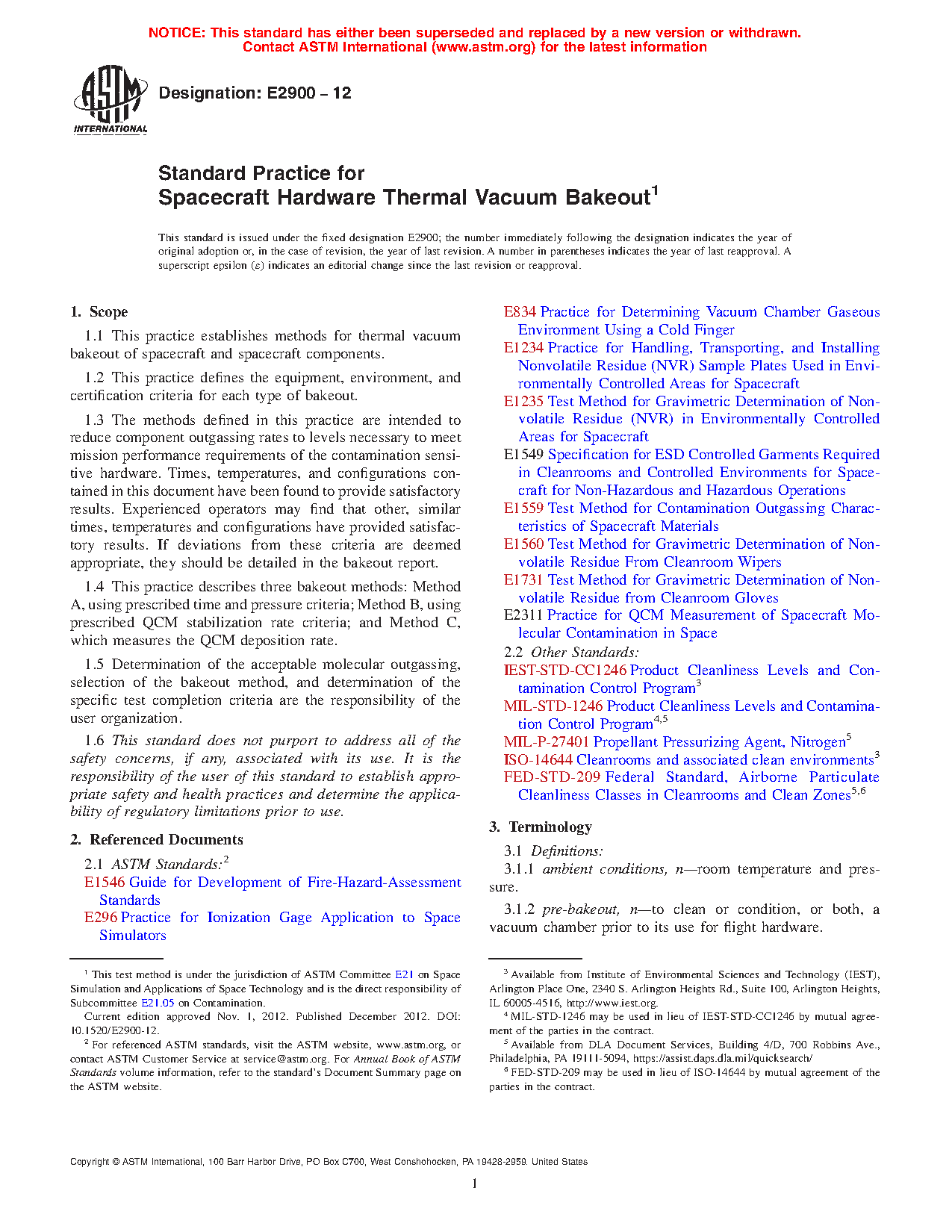 1.2 This practice defines the equipment, environment, and certification criteria for each type of bakeout.