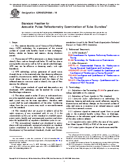 1.1 This practice describes use of Acoustic Pulse Reflectometry (APR) technology for examination of the internal surface of typical tube bundles found in heat exchangers, boilers, tubular air heaters and reactors, during shutdown periods.