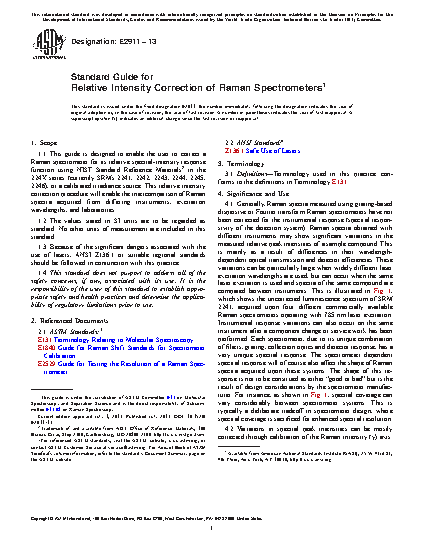 1.1 This guide is designed to enable the user to correct a Raman spectrometer for its relative spectral-intensity response function using NIST Standard Reference Materials2 in the 224X series (currently SRMs 2241, 2242, 2243, 2244, 2245, 2246), or a calibrated irradiance source. This relative intensity correction procedure will enable the intercomparison of Raman spectra acquired from differing instruments, excitation wavelengths, and laboratories.