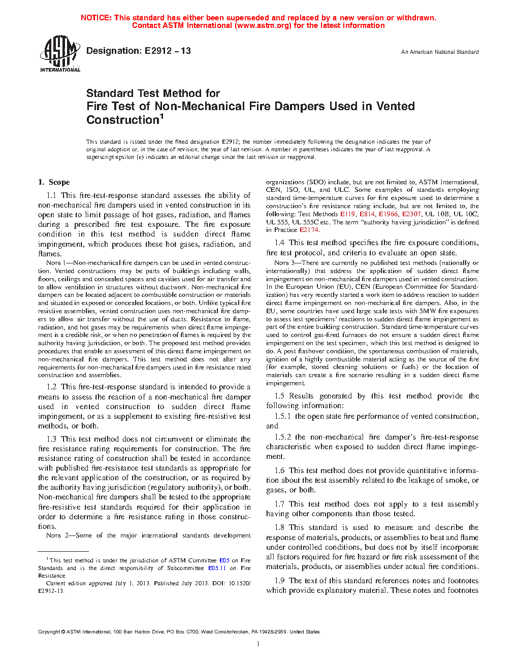 Some of the major international standards development organizations (SDO) include, but are not limited to, ASTM International, CEN, ISO, UL, and ULC. Some examples of standards employing standard time-temperature curves for fire exposure used to determine a construction’s fire resistance rating include, but are not limited to, the following: Test Methods E119, E814, E1966, E2307, UL 10B, UL 10C, UL 555, UL 555C etc. The term “authority having jurisdiction” is defined in Practice E2174. 1.4 This test method specifies the fire exposure conditions, fire test protocol, and criteria to evaluate an open state.