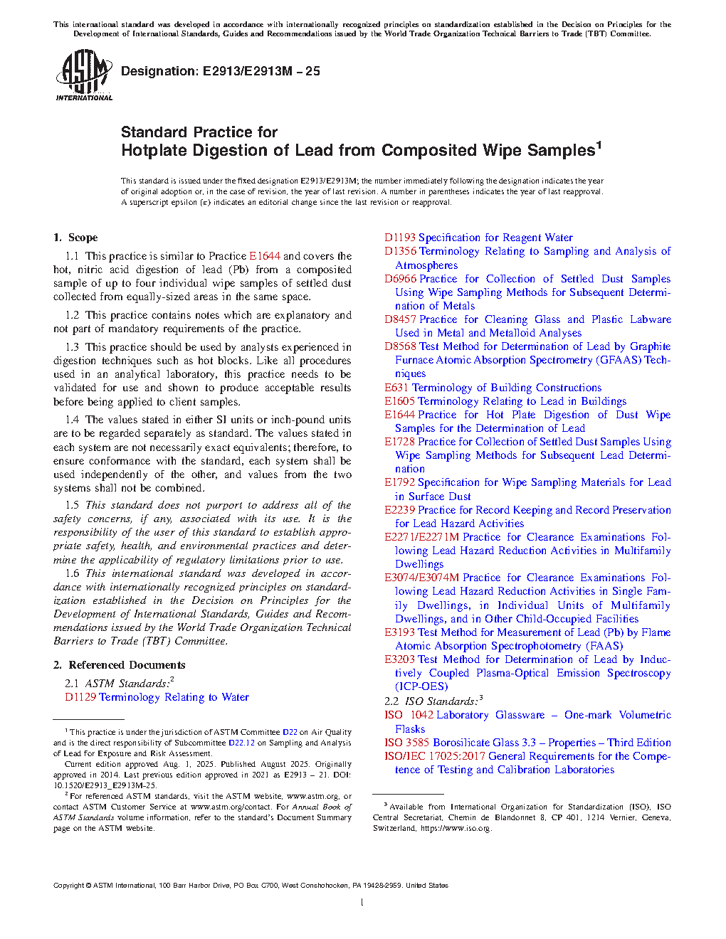 1.1 This practice is similar to Practice E1644 and covers the hot, nitric acid digestion of lead (Pb) from a composited sample of up to four individual wipe samples of settled dust collected from equally-sized areas in the same space.