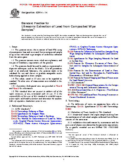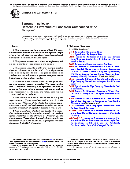 1.1 This practice covers the extraction of lead (Pb) using ultrasonication, heat and nitric acid from a composited sample of up to four individual wipe samples of settled dust collected from equally-sized areas in the same space.