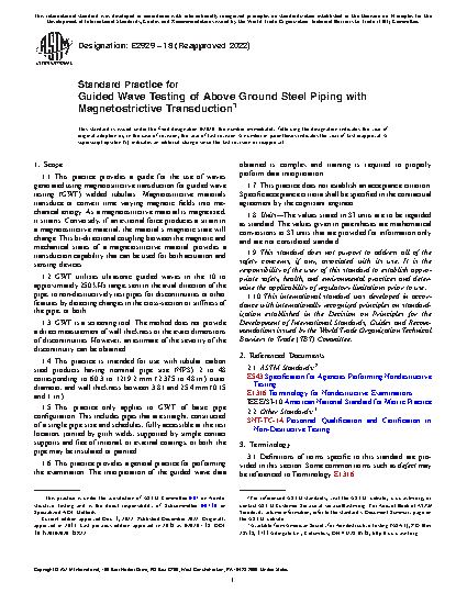 1.1 This practice provides a guide for the use of waves generated using magnetostrictive transduction for guided wave testing (GWT) welded tubulars. Magnetostrictive materials transduce or convert time varying magnetic fields into mechanical energy. As a magnetostrictive material is magnetized, it strains. Conversely, if an external force produces a strain in a magnetostrictive material, the material’s magnetic state will change. This bi-directional coupling between the magnetic and mechanical states of a magnetostrictive material provides a transduction capability that can be used for both actuation and sensing devices.