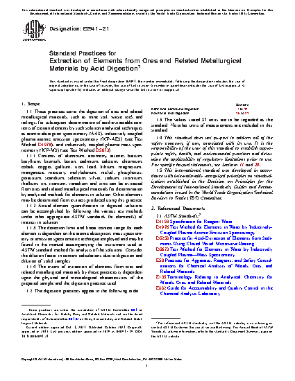 1.1 These practices cover the digestion of ores and related metallurgical materials, such as mine soil, waste rock and tailings, for subsequent determination of acid-extractable contents of certain elements by such solution analytical techniques as atomic absorption spectrometry (AAS), atomic emission spectrometry (ICP-AES), (see Test Method D1976), and inductively coupled plasma mass spectrometry (ICP-MS) (see Test Method D5673).