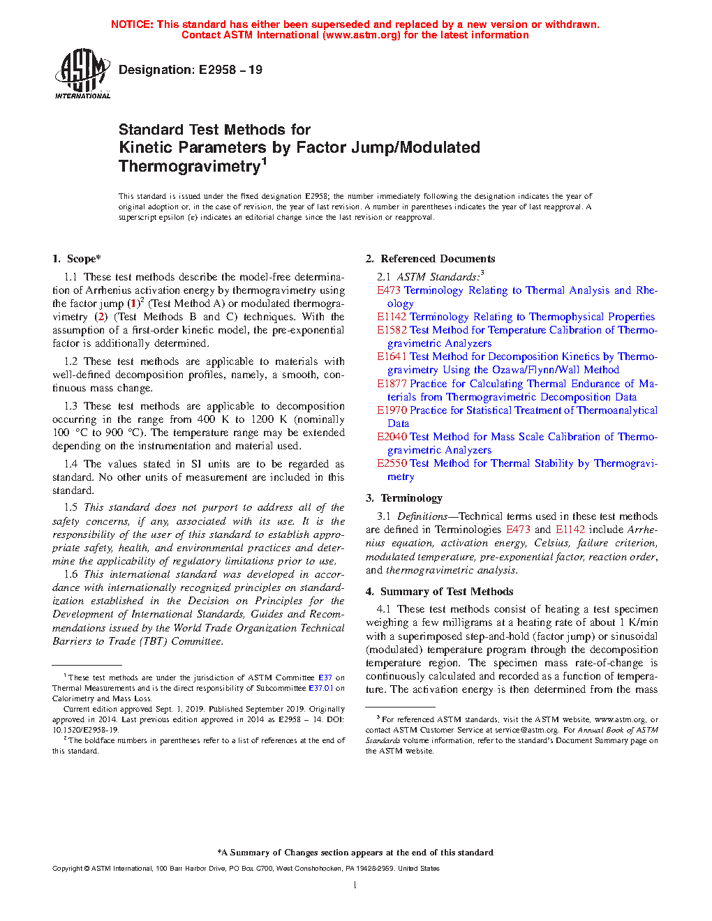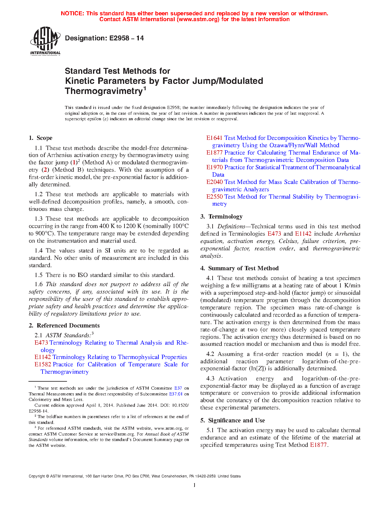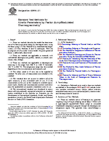 1.1 These test methods describe the model-free determination of Arrhenius activation energy by thermogravimetry using the factor jump (1)2 (Method A) or modulated thermogravimetry (2) (Method B) techniques. With the assumption of a first-order kinetic model, the pre-exponential factor is additionally determined.