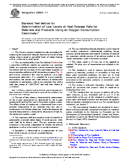 1.2 This test method differs from Test Method E1354 in that it prescribes a different specific test specimen size, specimen holder, test specimen orientation, a direct connection between the plenum and the top plate of the cone heater assembly to ensure complete collection of all the combustion gases (Fig. 1), and a lower volumetric flow rate for analyses via oxygen consumption calorimetry. It is intended for use on materials and products that contain only small amounts of combustible ingredients or components, such as test specimens that yield a peak heat release of <200 kW/m2 and total heat release of <15 MJ/m2.
