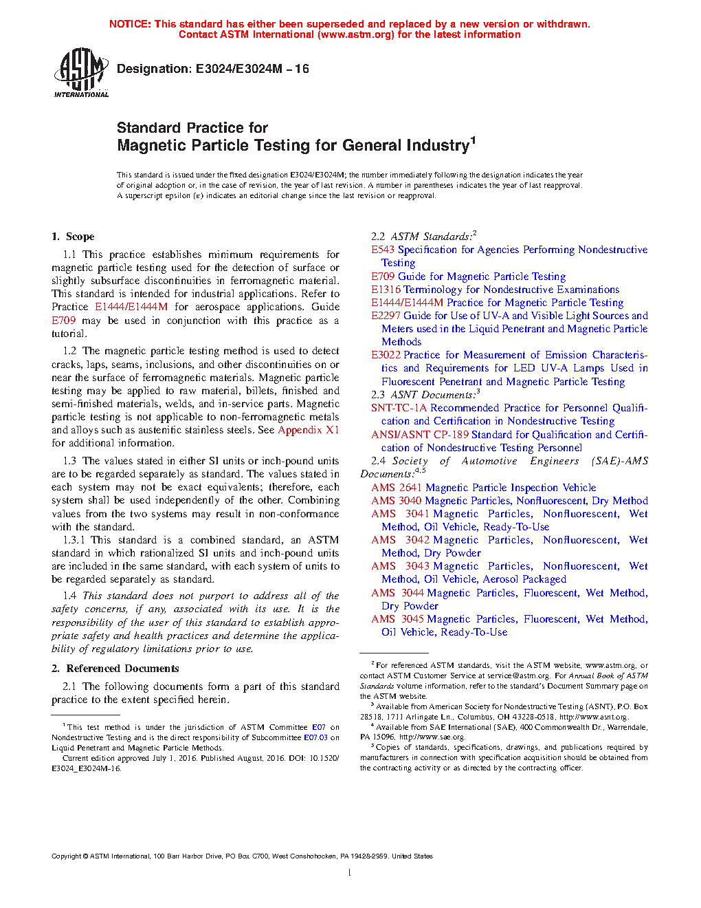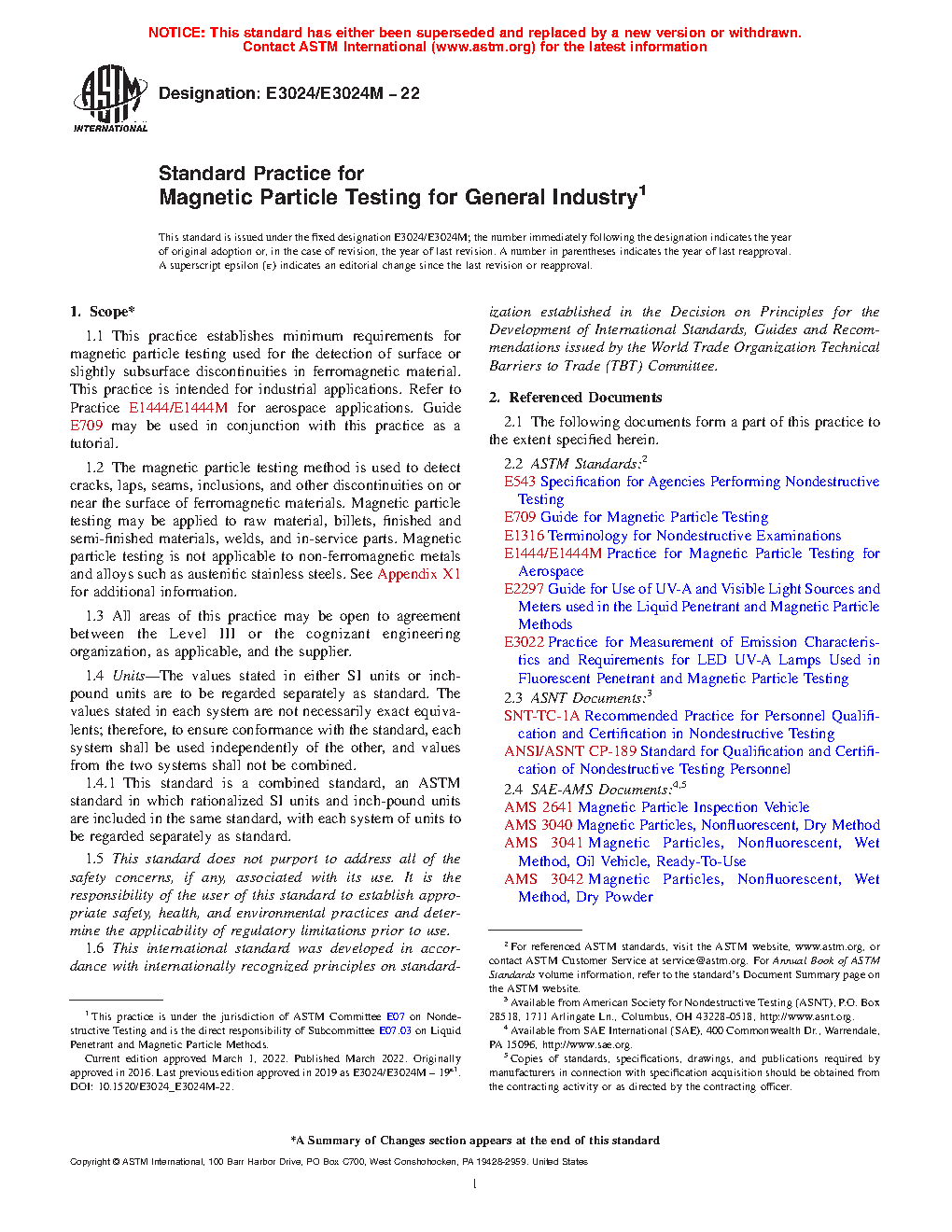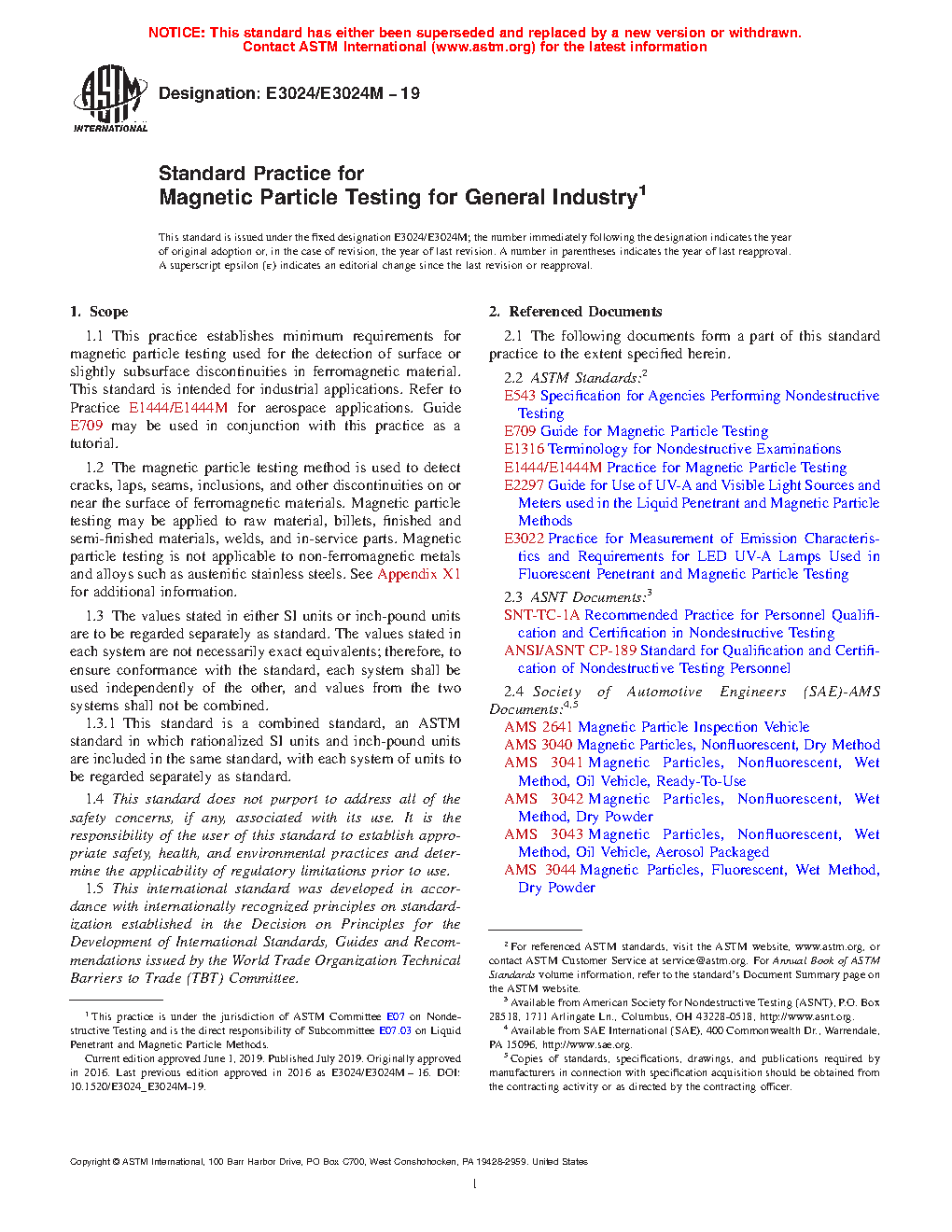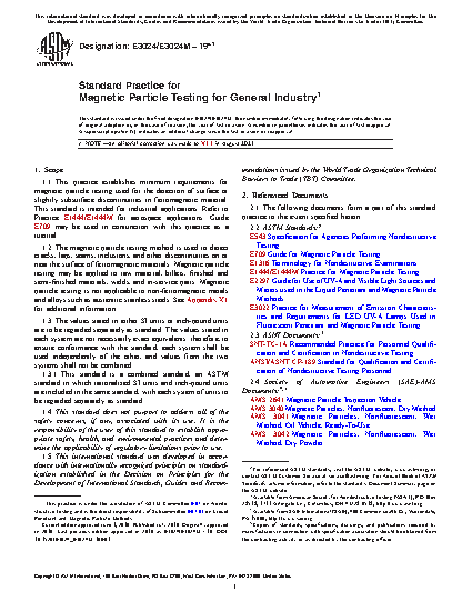 1.1 This practice establishes minimum requirements for magnetic particle testing used for the detection of surface or slightly subsurface discontinuities in ferromagnetic material. This standard is intended for industrial applications. Refer to Practice E1444/E1444M for aerospace applications. Guide E709 may be used in conjunction with this practice as a tutorial.