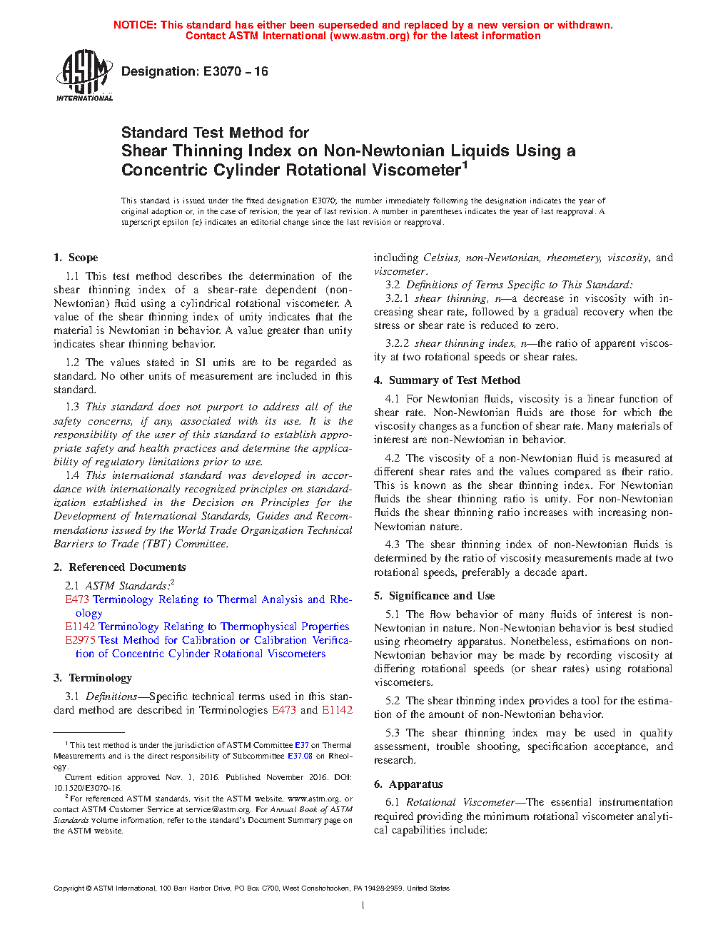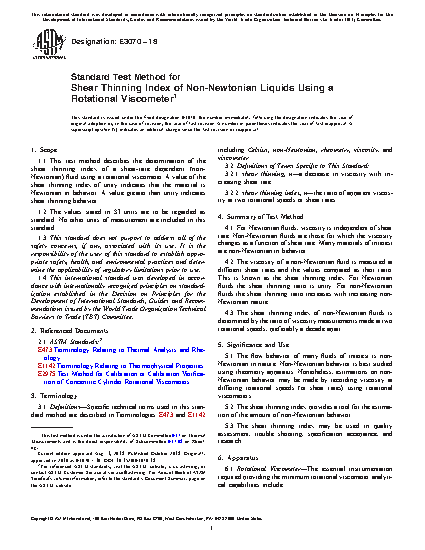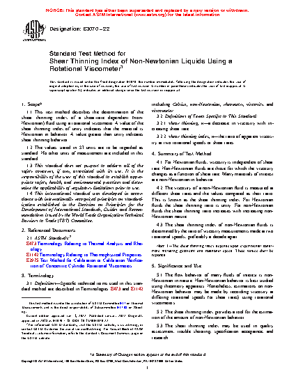 1.1 This test method describes the determination of the shear thinning index of a shear-rate dependent (non-Newtonian) fluid using a rotational viscometer. A value of the shear thinning index of unity indicates that the material is Newtonian in behavior. A value greater than unity indicates shear thinning behavior.