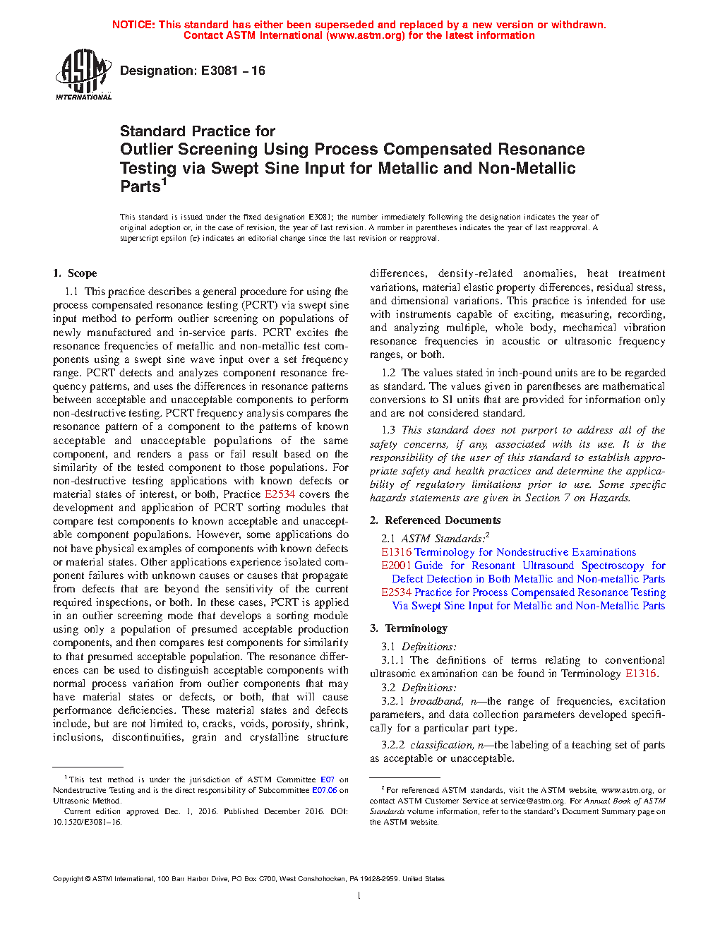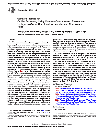 1.1 This practice describes a general procedure for using the process compensated resonance testing (PCRT) via swept sine input method to perform outlier screening on populations of newly manufactured and in-service parts. PCRT excites the resonance frequencies of metallic and non-metallic test components using a swept sine wave input over a set frequency range. PCRT detects and analyzes component resonance frequency patterns and uses the differences in resonance patterns between acceptable and unacceptable components to perform non-destructive testing. PCRT frequency analysis compares the resonance pattern of a component to the patterns of known reference populations of the same component and renders a pass or fail result based on the similarity of the tested component to those populations. For non-destructive testing applications with known defects or material states of interest, or both, Practice E2534 covers the development and application of PCRT sorting modules that compare test components to known acceptable and unacceptable component populations. However, some applications do not have physical examples of components with known defects or material states. Other applications experience isolated component failures with unknown causes or causes that propagate from defects that are beyond the sensitivity of the current required inspections, or both. In these cases, PCRT is applied in an outlier screening mode that develops a sorting module using only a population of presumed acceptable production components, and then compares test components for similarity to that presumed acceptable population. The resonance differences can be used to distinguish acceptable components with normal process variation from outlier components that may have material states or defects, or both, that will cause performance deficiencies. These material states and defects include, but are not limited to, cracks, voids, porosity, shrink, inclusions, discontinuities, grain and crystalline structure differences, density-related anomalies, heat treatment variations, material elastic property differences, residual stress, and dimensional variations. This practice is intended for use with instruments capable of exciting, measuring, recording, and analyzing multiple, whole body, mechanical vibration resonance frequencies in acoustic or ultrasonic frequency ranges, or both.
