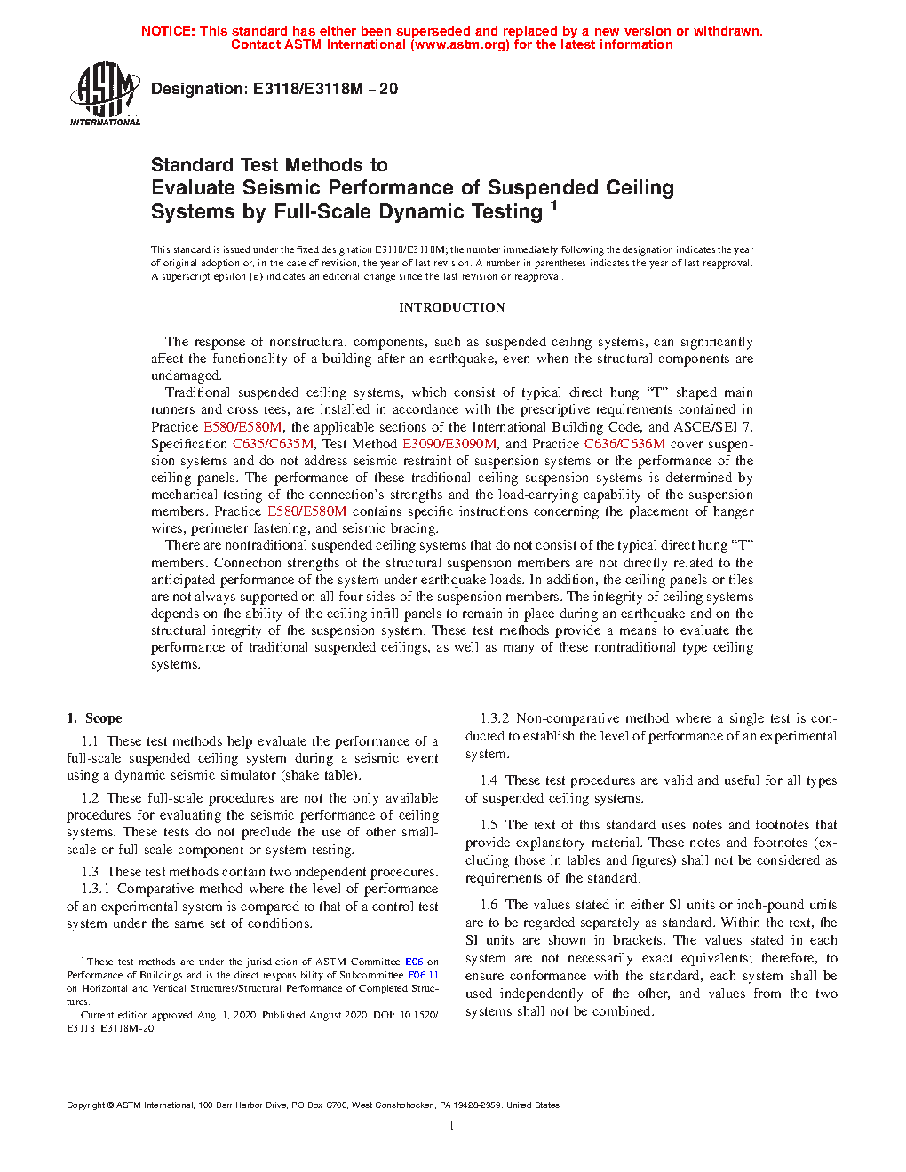 1.1 These test methods help evaluate the performance of a full-scale suspended ceiling system during a seismic event using a dynamic seismic simulator (shake table).