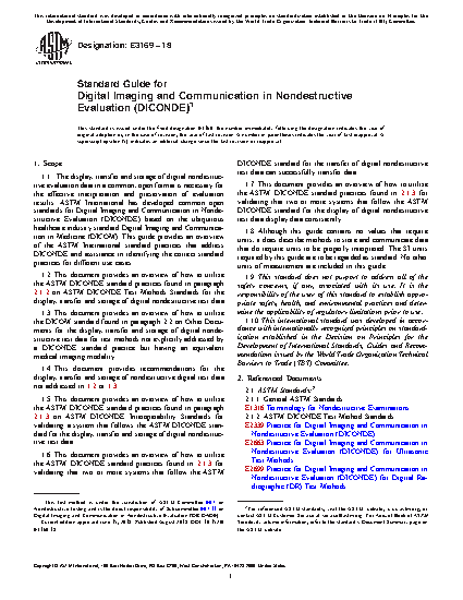 1.1 The display, transfer and storage of digital nondestructive evaluation data in a common, open format is necessary for the effective interpretation and preservation of evaluation results. ASTM International has developed common open standards for Digital Imaging and Communication in Nondestructive Evaluation (DICONDE) based on the ubiquitous healthcare industry standard Digital Imaging and Communication in Medicine (DICOM). This guide provides an overview of the ASTM International standard practices that address DICONDE and assistance in identifying the correct standard practices for different use cases.