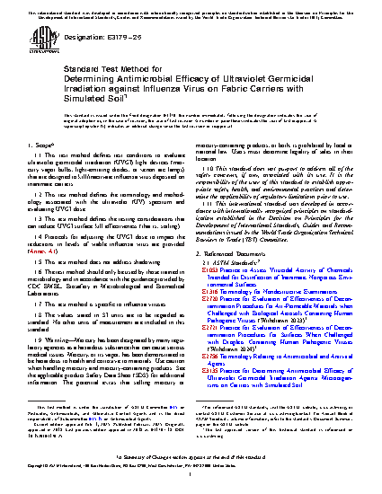 1.1 This test method defines test conditions to evaluate ultraviolet germicidal irradiation (UVGI) light devices (mercury vapor bulbs, light-emitting diodes, or xenon arc lamps) that are designed to kill/inactivate influenza virus deposited on inanimate carriers.