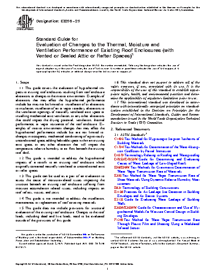 1.1 This guide covers the evaluation of hygrothermal impacts to existing roof enclosures resulting from roof enclosure alterations or changes to the interior environment. Examples of alterations that may affect the hygrothermal performance include but may not be limited to: installation of or alterations to insulation, installation of air or vapor retarders, alterations to the ventilation openings of naturally ventilated attic space or installing mechanical attic ventilation, or any other alterations that could impact the drying potential, ventilation, thermal performance, or vapor resistance of the roof enclosure. Examples of interior environment changes that may affect the hygrothermal performance include but are not limited to: changes in occupancy, mechanical conditioning of a previously unconditioned space, adding habitable space within an existing attic space, or any other alteration that will impact the temperature, relative humidity, or air flow beneath the existing roof deck.