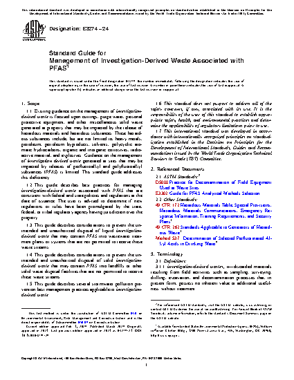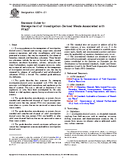 1.2 This guide describes best practices for managing investigation-derived waste associated with PFAS that are consistent with federal and state policies and regulations at the date of issuance. The user is advised to determine if new regulations or rules have been promulgated by the state, federal, or tribal regulatory agency having jurisdiction over the property.
