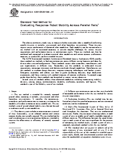 5.4 Evaluation—This test method can be used in a controlled environment to measure baseline capabilities. The parallel rails apparatus can also be embedded into operational training scenarios to measure degradation due to uncontrolled variables in lighting, weather, radio communications, GPS accuracy, etc.