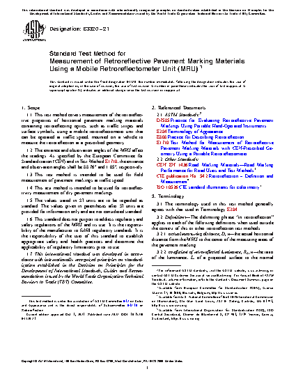 1.1 This test method covers measurement of the retroreflective properties of horizontal pavement marking materials containing retroreflecting optics, such as traffic stripes and surface symbols, using a mobile retroreflectometer unit that can be operated at traffic speed, mounted on a vehicle to measure the retroreflection at a prescribed geometry.