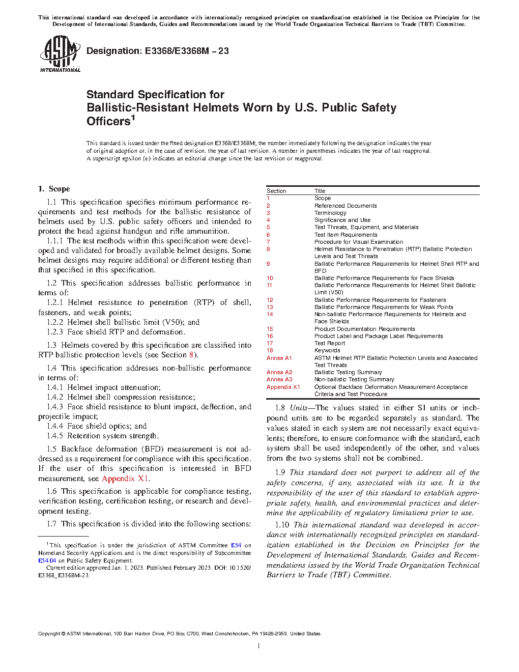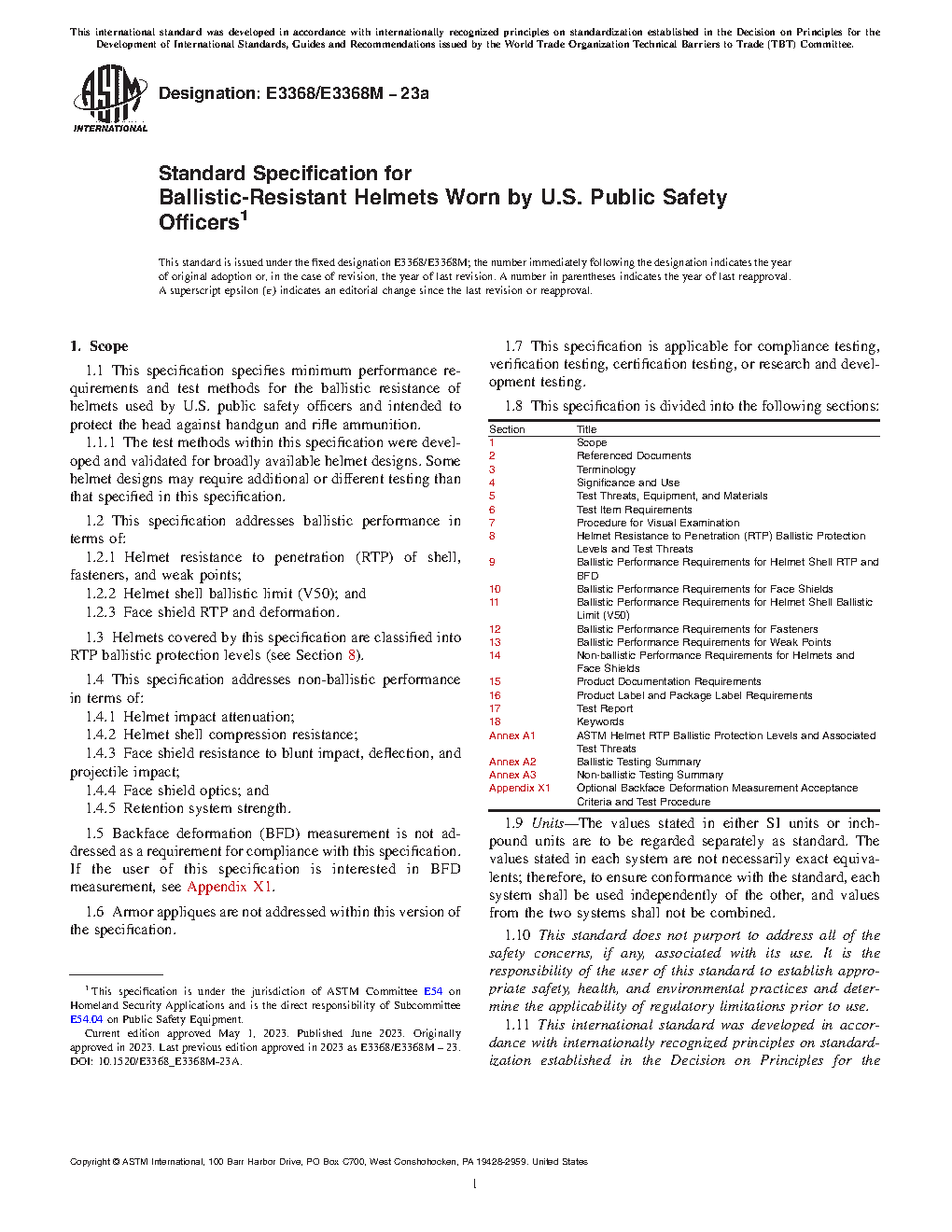 1.1 This specification specifies minimum performance requirements and test methods for the ballistic resistance of helmets used by U.S. public safety officers and intended to protect the head against handgun and rifle ammunition.