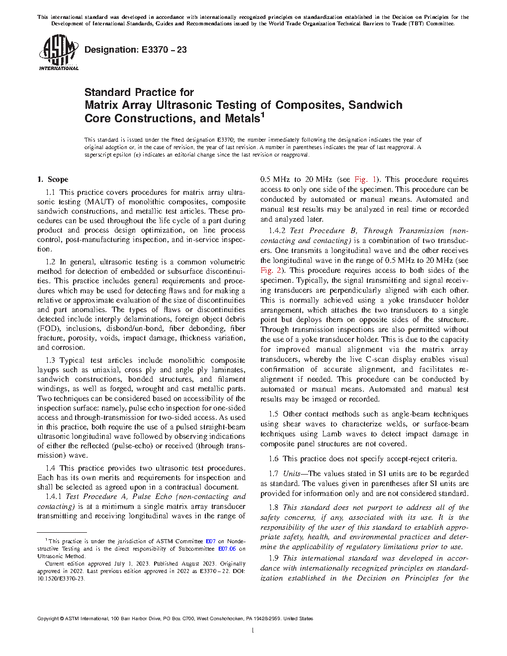 1.1 This practice establishes procedures for matrix array ultrasonic testing (MAUT) of monolithic composites, composite sandwich constructions, and metallic test articles. These procedures can be used throughout the life cycle of a part during product and process design optimization, on line process control, post-manufacturing inspection, and in-service inspection.