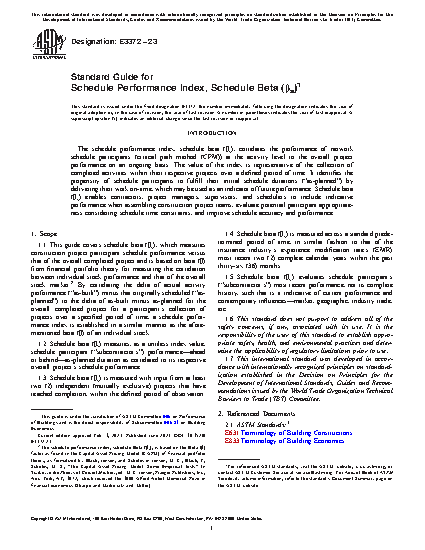 1.1 This guide covers schedule beta (ßs), which measures construction project participant schedule performance versus that of the overall completed project and is based on beta (ß) from financial portfolio theory for measuring the correlation between individual stock performance and that of the overall stock market.2 By correlating the delta of actual activity performance (“as-built”) minus that originally scheduled (“as-planned”) to the delta of as-built minus as-planned for the overall completed project for a participant’s collection of projects over a specified period of time, a schedule performance index is established in a similar manner as the aforementioned beta (ß) of an individual stock.