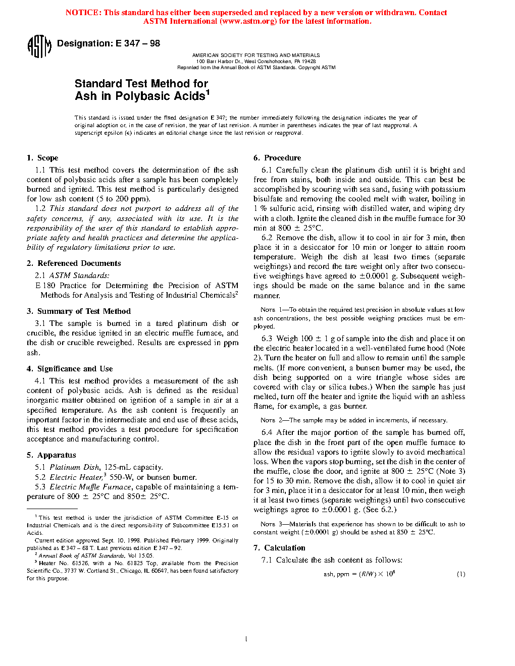 Standard Test Method for Ash in Polybasic Acids (Withdrawn 2003)