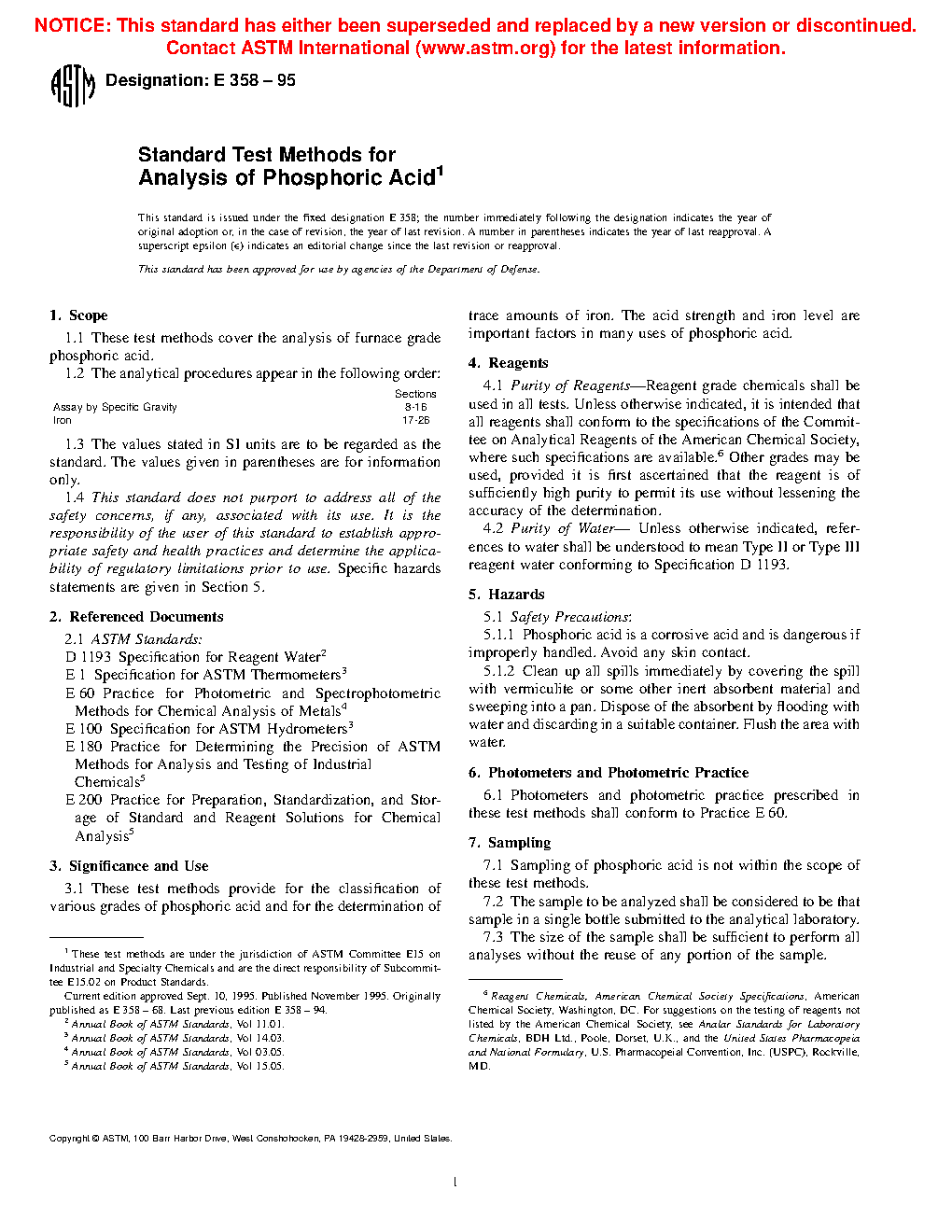 Test Methods for Analysis of Phosphoric Acid (Withdrawn 2000)