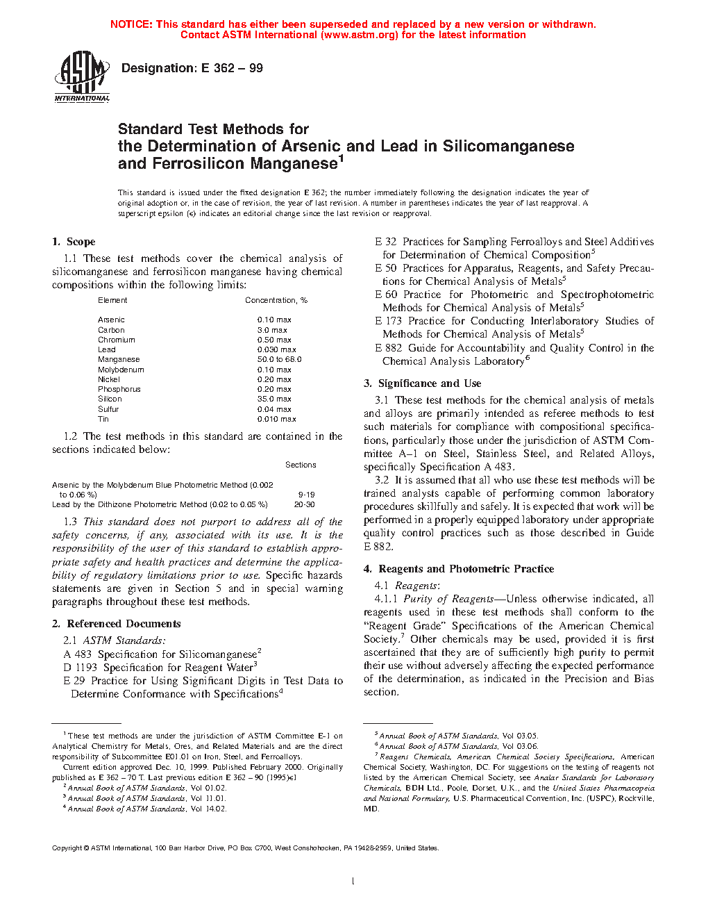 Standard Test Methods for the Determination of Arsenic and Lead in Silicomanganese and Ferrosilicon Manganese (Withdrawn 2005)