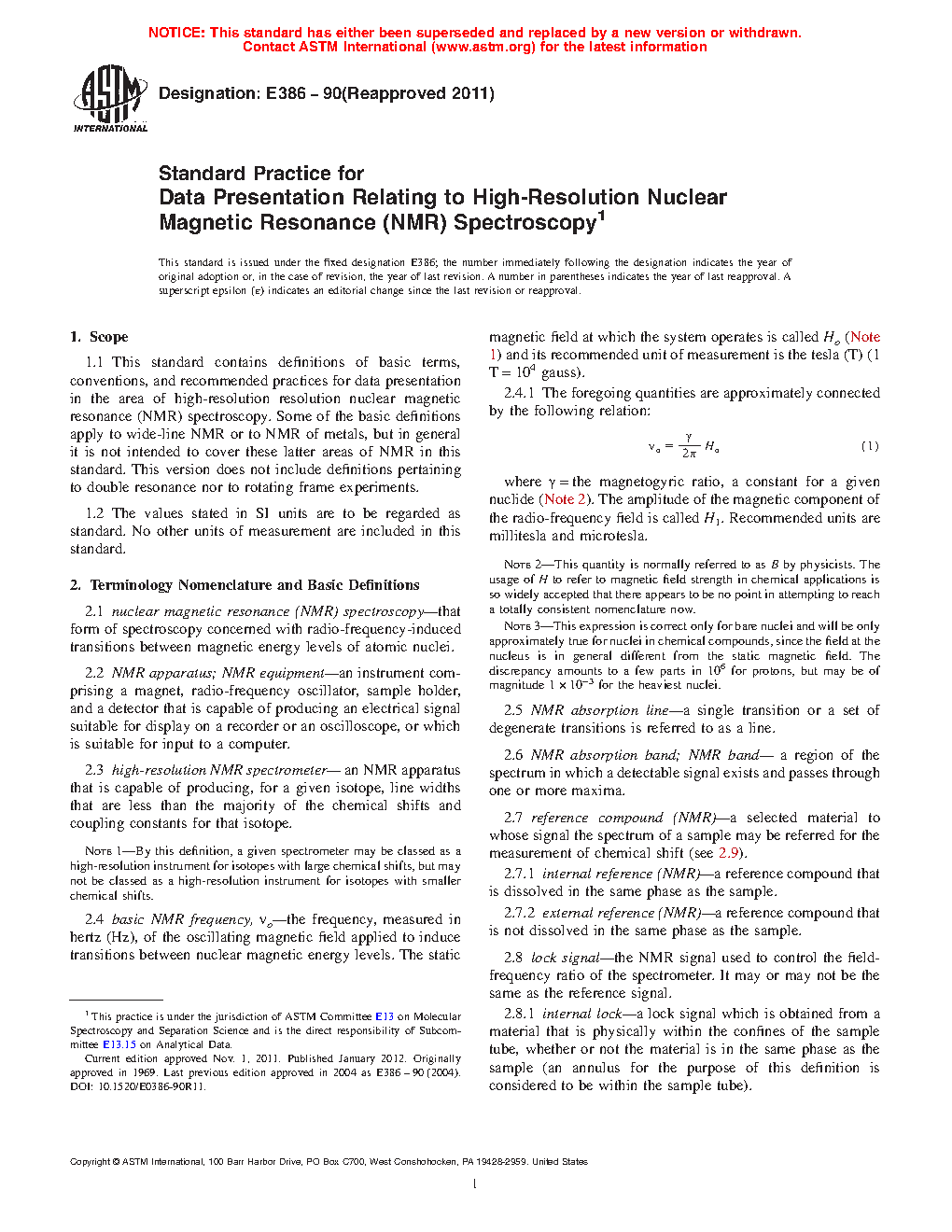 1.1 This standard contains definitions of basic terms, conventions, and recommended practices for data presentation in the area of high-resolution resolution nuclear magnetic resonance (NMR) spectroscopy. Some of the basic definitions apply to wide-line NMR or to NMR of metals, but in general it is not intended to cover these latter areas of NMR in this standard. This version does not include definitions pertaining to double resonance nor to rotating frame experiments.