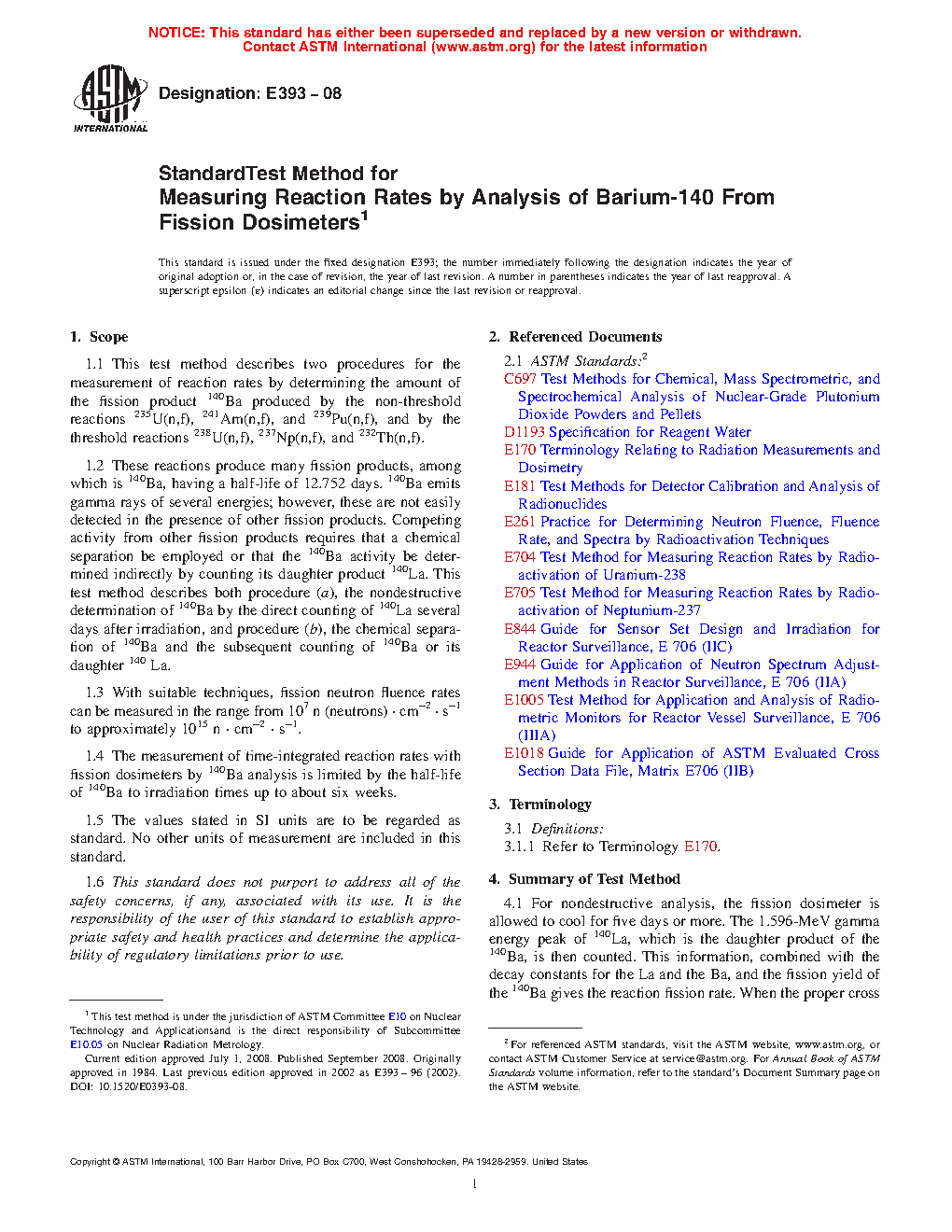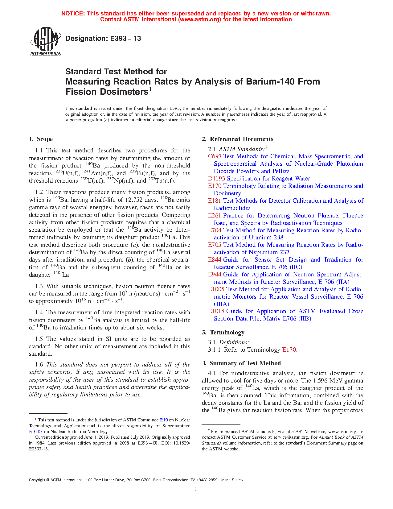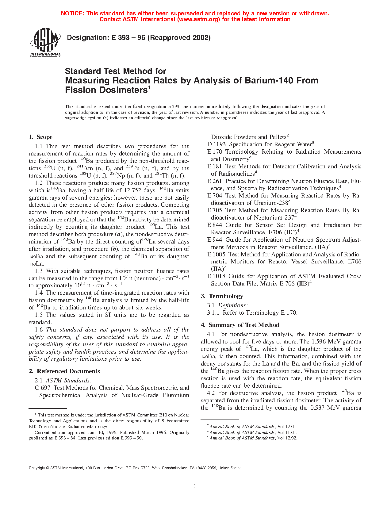 1.1 This test method describes two procedures for the measurement of reaction rates by determining the amount of the fission product Ba produced by the non-threshold reactions 235 U (n, f), 241 Am (n, f), and 239 Pu (n, f), and by the threshold reactions 238 U (n, f), 237 Np (n, f), and 232 Th (n, f).