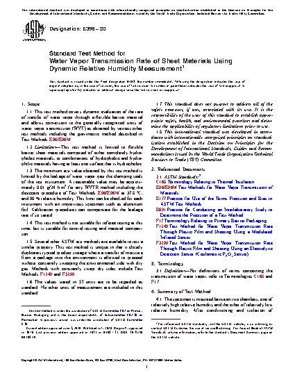 1.5 Several other ASTM test methods are available to test a similar property. This test method is unique in that it closely duplicates typical product storage where a transfer of moisture from a package into the environment is allowed to proceed without constantly sweeping the environmental side with dry gas. Methods with constantly swept dry sides include Test Methods F1249 and F3299.