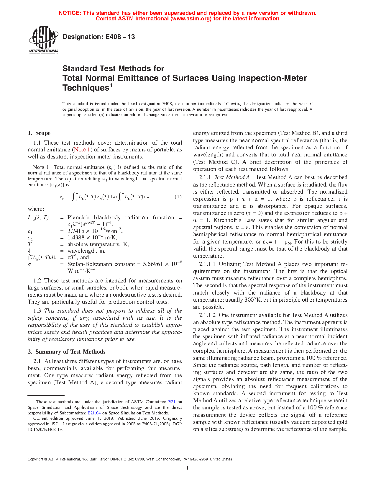 1.1 These test methods cover determination of the total normal emittance (Note) of surfaces by means of portable, inspection-meter instruments. Note 1Total normal emittance (