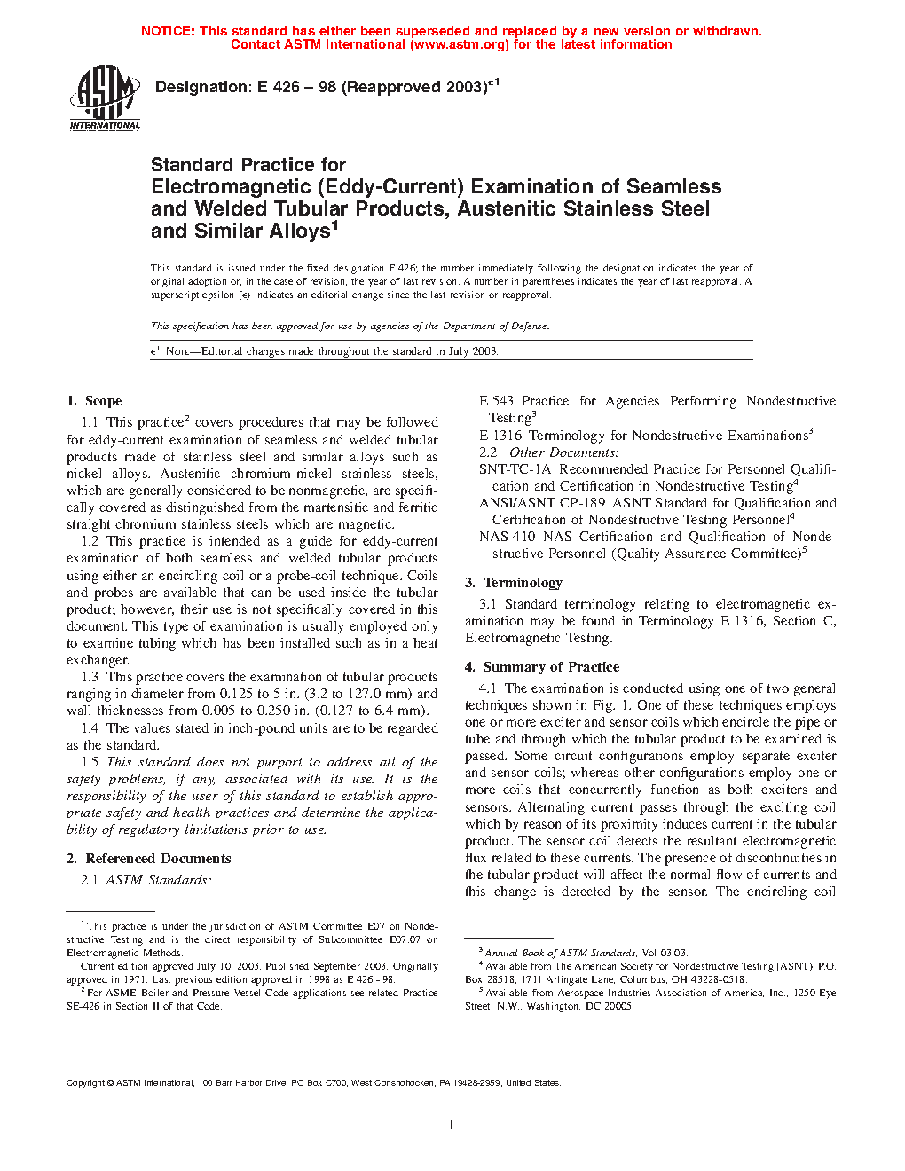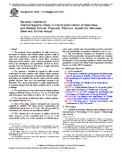 1.2 This practice is intended as a guide for eddy-current examination of both seamless and welded tubular products using either an encircling coil or a probe-coil technique. Coils and probes are available that can be used inside the tubular product; however, their use is not specifically covered in this document. This type of examination is usually employed only to examine tubing which has been installed such as in a heat exchanger.