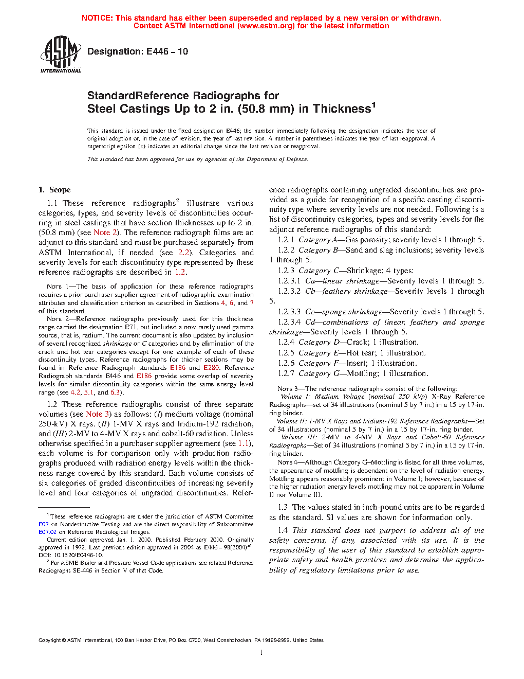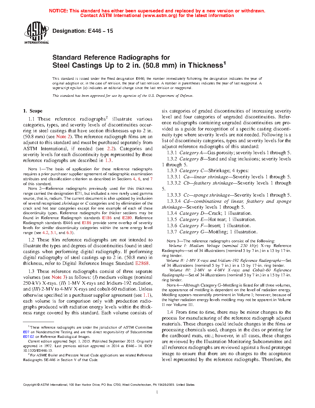 Note 2: Reference radiographs previously used for this thickness range carried the designation E71, but included a now rarely used gamma source, that is, radium. The current document is also updated by inclusion of several recognized shrinkage or C categories and by elimination of the crack and hot tear categories, except for one example of each of these discontinuity types. Reference radiographs for thicker sections may be found in Reference Radiographs E186 and E280. Reference Radiographs E446 and E186 provide some overlap of severity levels for similar discontinuity categories within the same energy level range (see 4.3, 5.1, and 6.3).