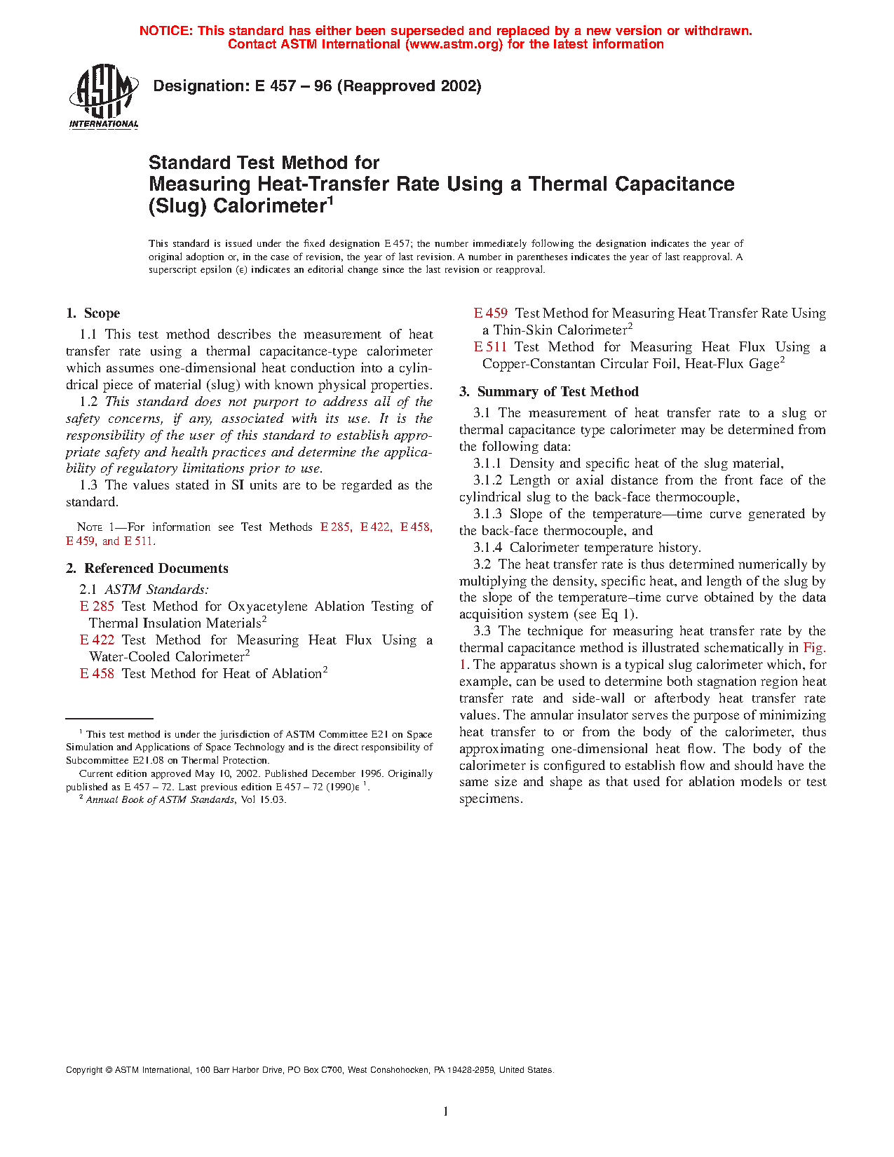 1.1 This test method describes the measurement of heat transfer rate using a thermal capacitance-type calorimeter which assumes one-dimensional heat conduction into a cylindrical piece of material (slug) with known physical properties.