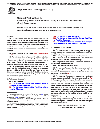 The purpose of this test method is to measure the rate of thermal energy per unit area transferred into a known piece of material (slug) for purposes of calibrating the thermal environment into which test specimens are placed for evaluation. The calorimeter and holder size and shape should be identical to that of the test specimen. In this manner, the measured heat transfer rate to the calorimeter can be related to that experienced by the test specimen.