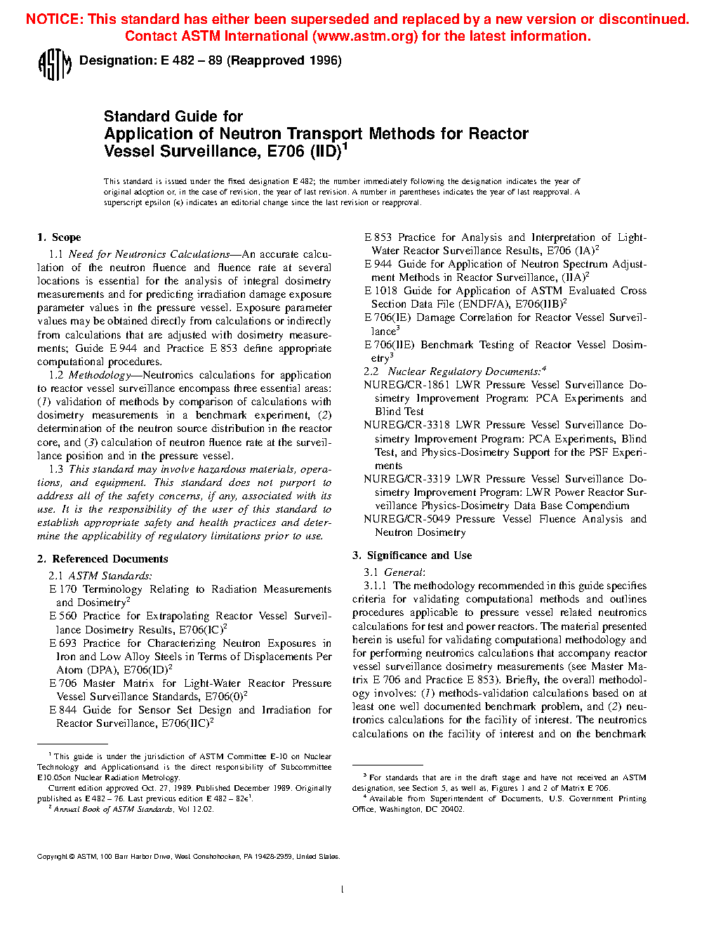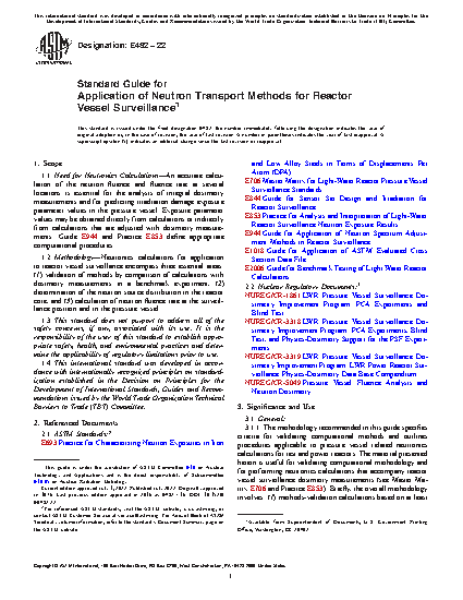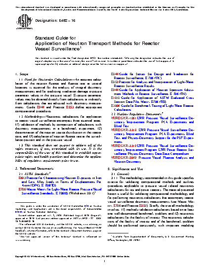 1.2 Methodology—Neutronics calculations for application to reactor vessel surveillance encompass three essential areas: (1) validation of methods by comparison of calculations with dosimetry measurements in a benchmark experiment, (2) determination of the neutron source distribution in the reactor core, and (3) calculation of neutron fluence rate at the surveillance position and in the pressure vessel.