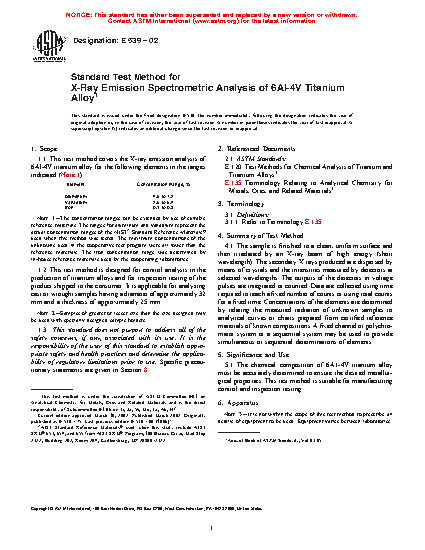 Standard Test Method for X-Ray Emission Spectrometric Analysis of 6AI-4V Titanium Alloy
