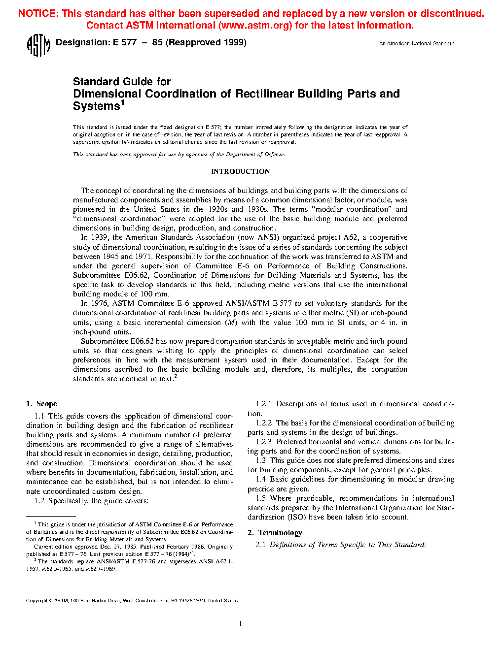 This guide covers the application of dimensional coordination in building design and the fabrication of rectilinear building parts and systems. A minimum number of preferred dimensions are recommended to give a range of alternatives that should result in economies in design, detailing, production, and construction. Dimensional coordination should be used where benefits in documentation, fabrication, installation, and maintenance can be established, but is not intended to eliminate uncoordinated custom design. Dimensional coordination of buildings and rectilinear building parts is based on the application of three related concepts such as modular reference grids of lines or planes to define reference locations in space, controlling dimensions in the horizontal and vertical plane as means of controlling the location of major building elements and rectilinear building parts, and coordinating dimensions for building components to reduce variety of sizes and to promote a better fit within the controlling reference system therefore minimizing wasteful cutting or fitting on site. The reference system for dimensionally coordinated design may consist of: a standard modular grid of dimensions; a multimodular grid of two or three dimensions, which may use different modules in different directions; or, a selected set of reference planes or lines spaced at modular intervals but without the use of a regular grid. The reference system is used in design and detailing decisions to locate building parts that may or may not be shown on working drawings.