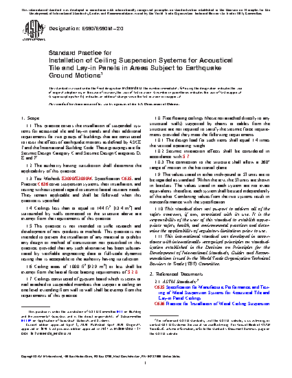 1.1 This practice covers the installation of suspended systems for acoustical tile and lay-in panels and their additional requirements for two groups of buildings that are constructed to resist the effects of earthquake motions as defined by ASCE 7 and the International Building Code. These groupings are for Seismic Design Category C and Seismic Design Categories D, E and F.