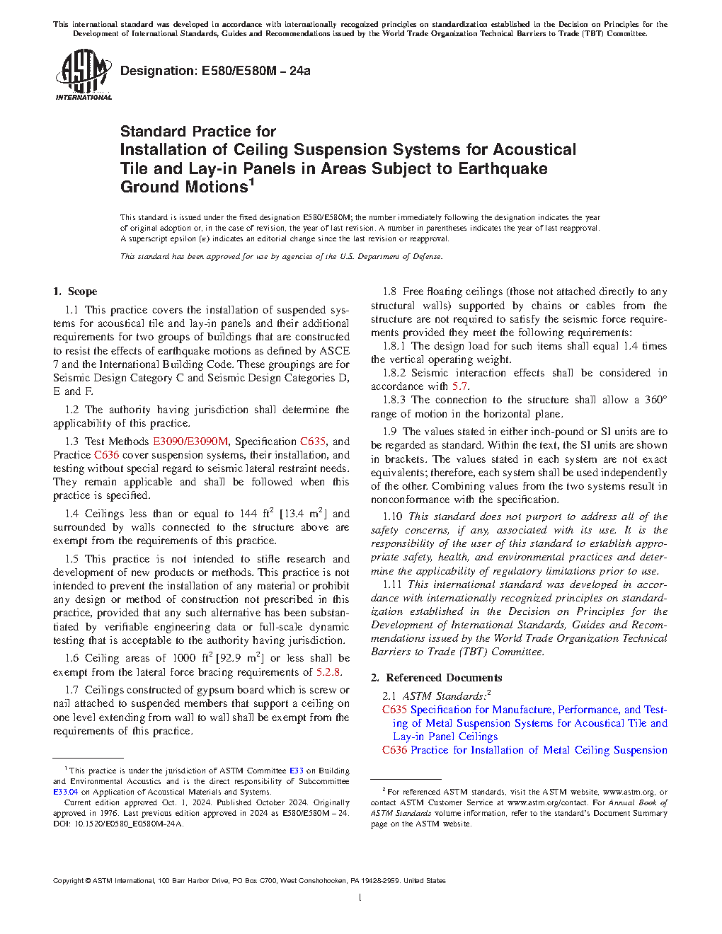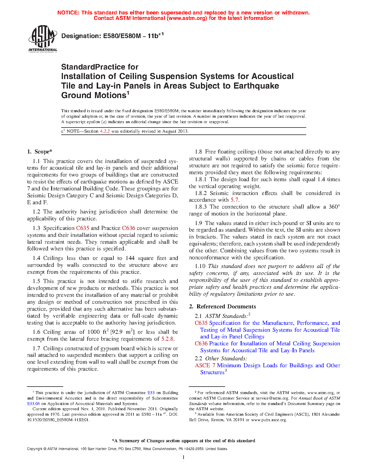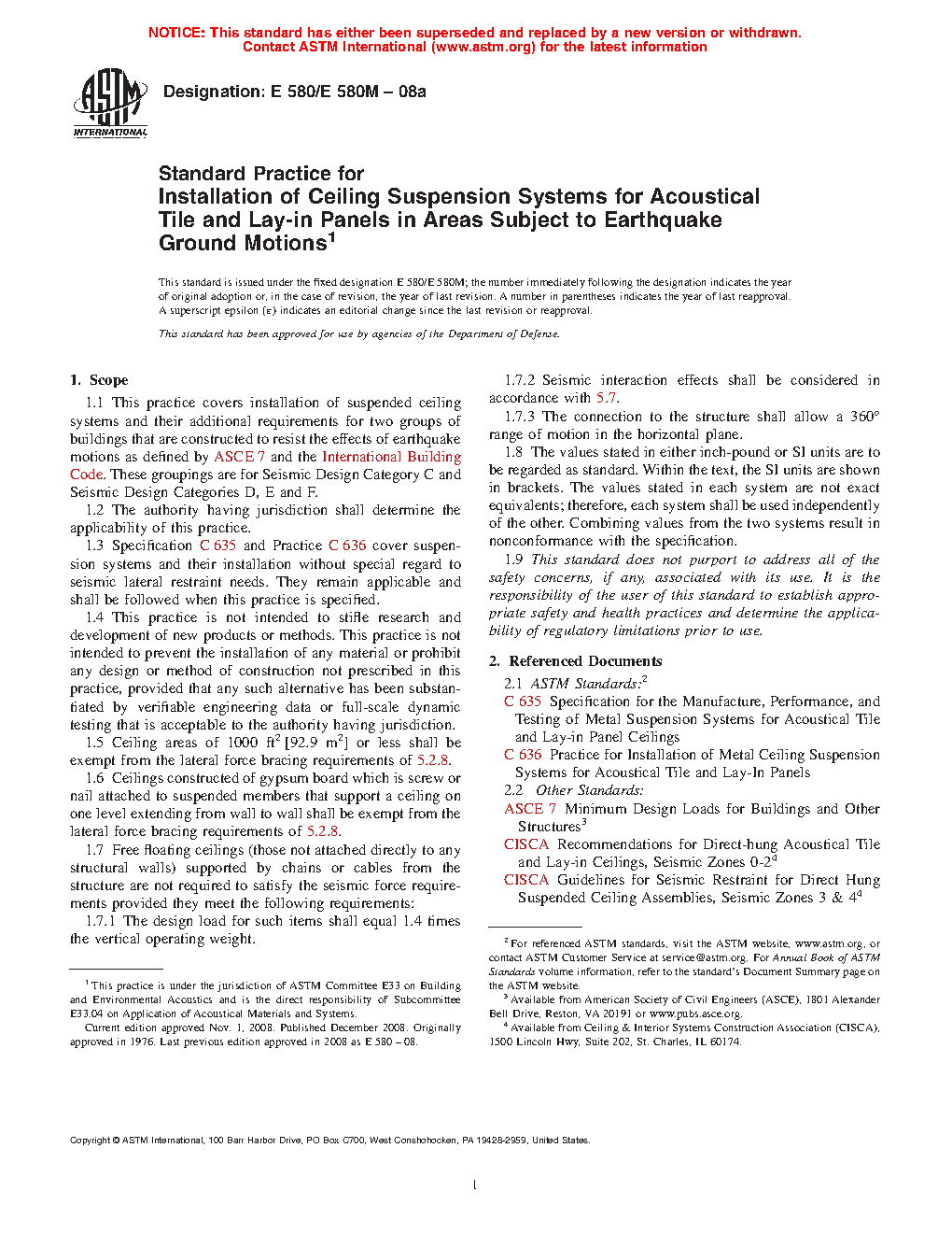 3.2 This practice covers installation of suspended ceiling systems and related components in areas that require resistance to the effects of earthquake motions as defined by ASCE 7 and the International Building Code.