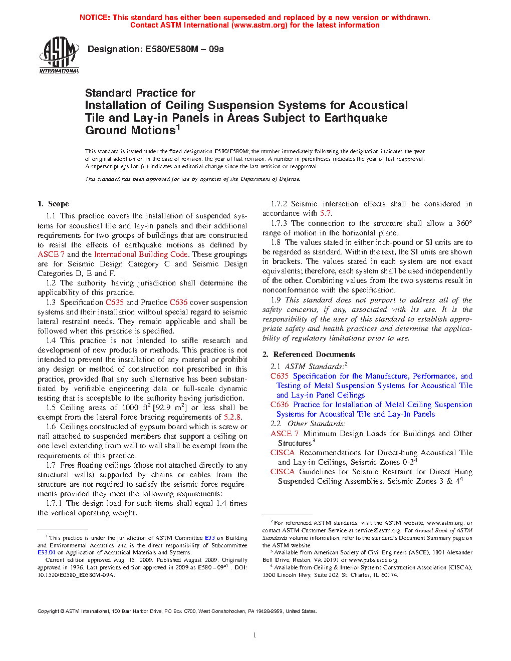 1.3 Test Methods E3090/E3090M, Specification C635, and Practice C636 cover suspension systems, their installation, and testing without special regard to seismic lateral restraint needs. They remain applicable and shall be followed when this practice is specified.