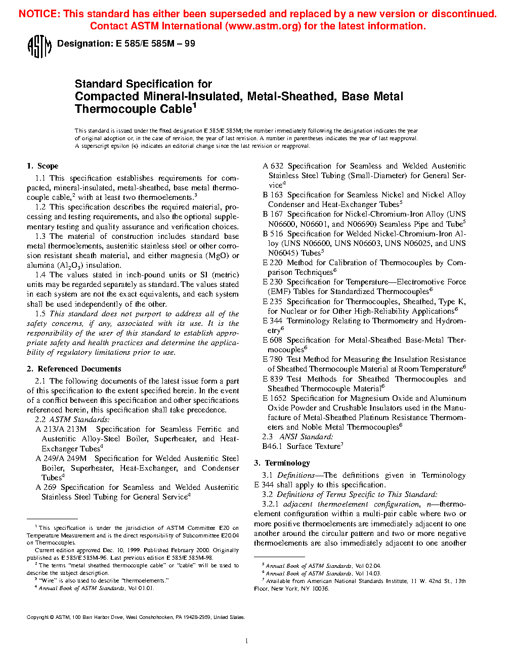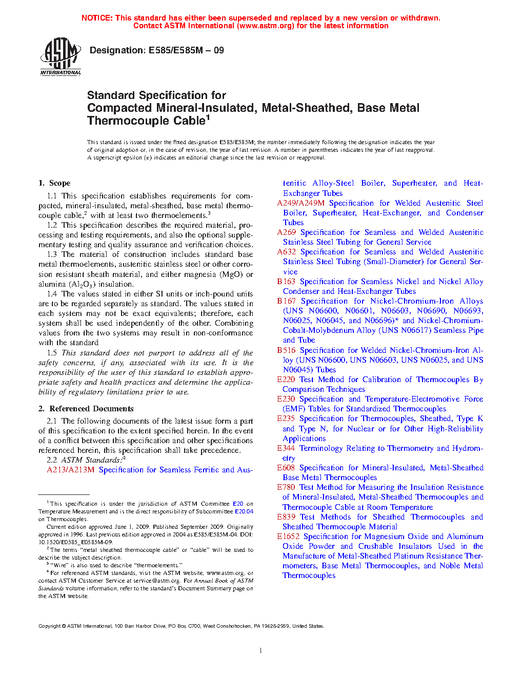 1.1 This specification establishes requirements for compacted, mineral-insulated, metal-sheathed, base-metal thermocouple cable, with at least two thermoelements.