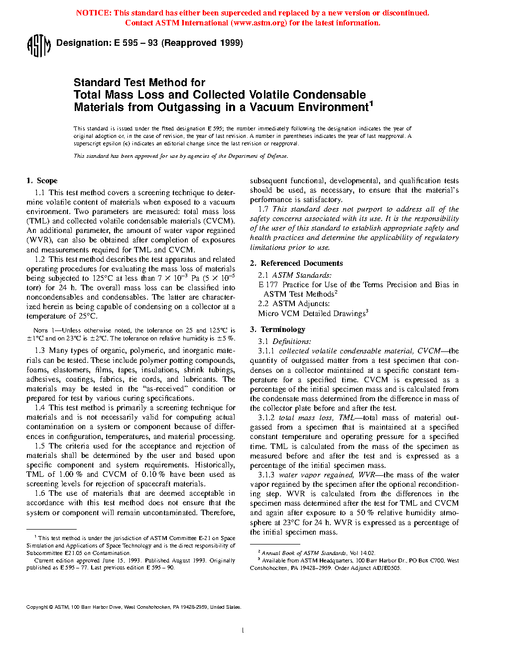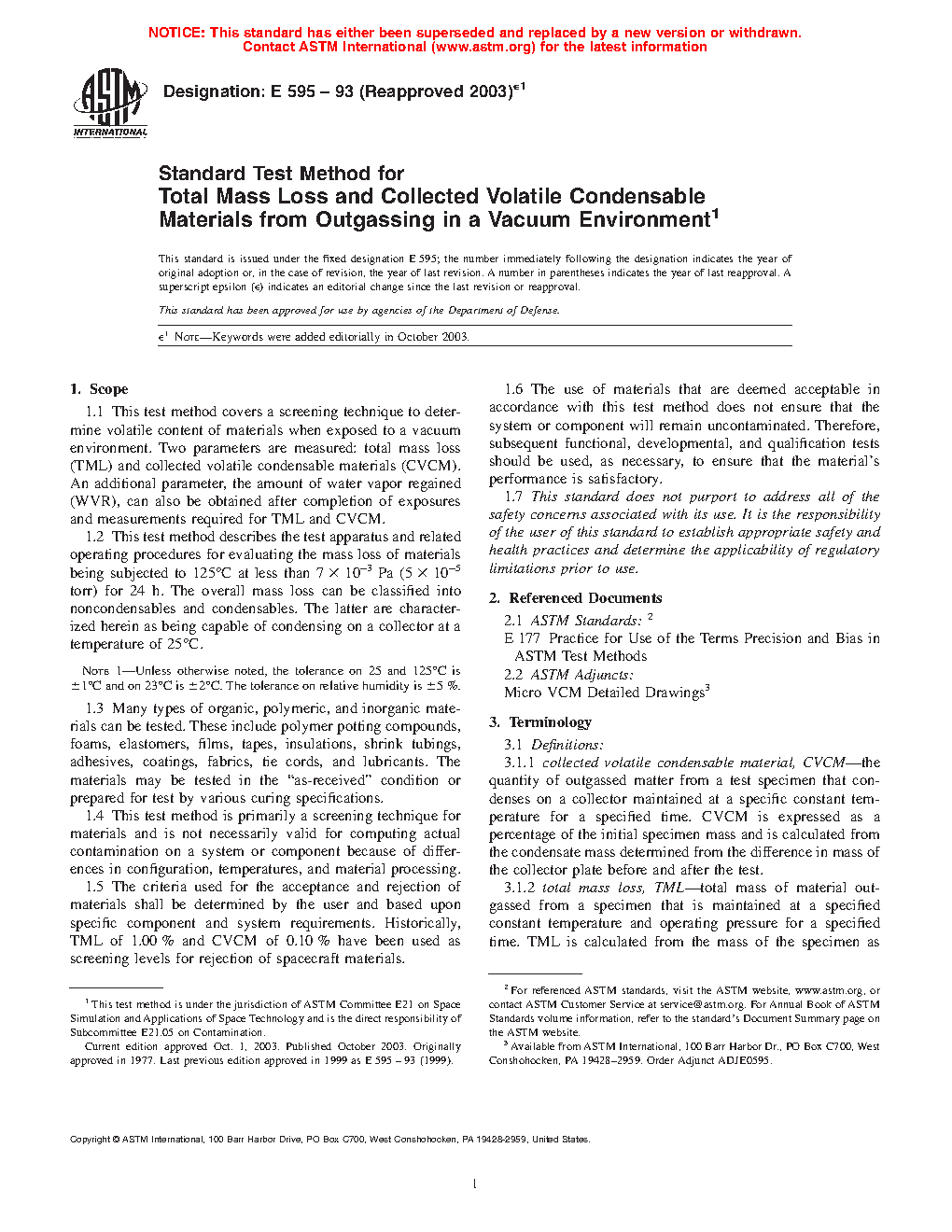 1.5 The criteria used for the acceptance and rejection of materials shall be determined by the user and based upon specific component and system requirements. Historically, TML of 1.00% and CVCM of 0.10% have been used as screening levels for rejection of spacecraft materials.