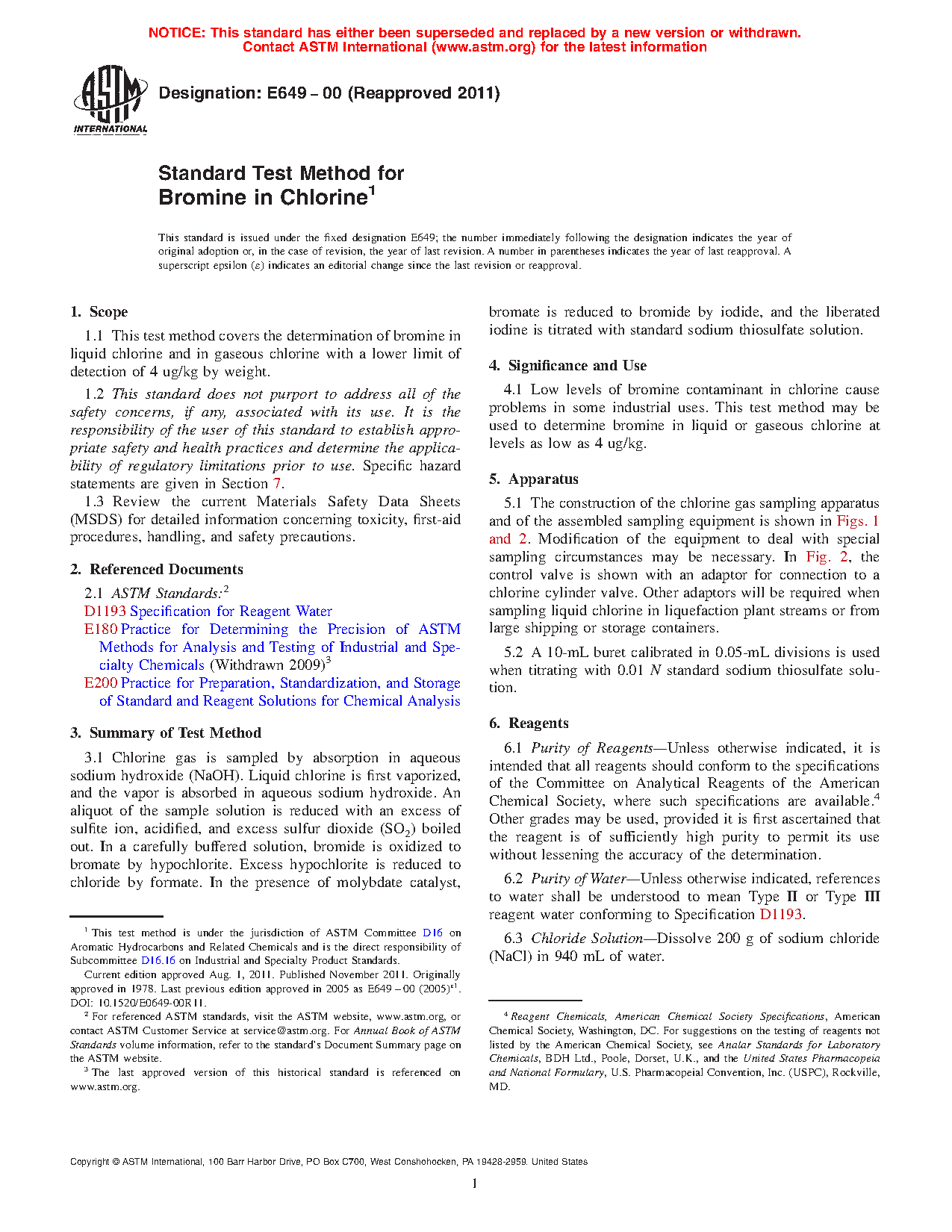 4.1 Low levels of bromine contaminant in chlorine cause problems in some industrial uses. This test method may be used to determine bromine in liquid or gaseous chlorine at levels as low as 4 ug/kg.