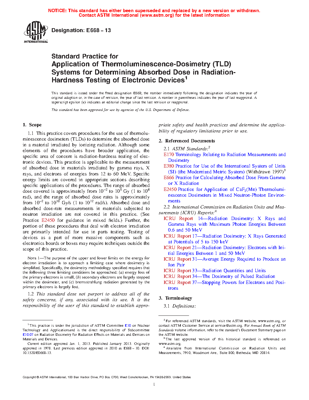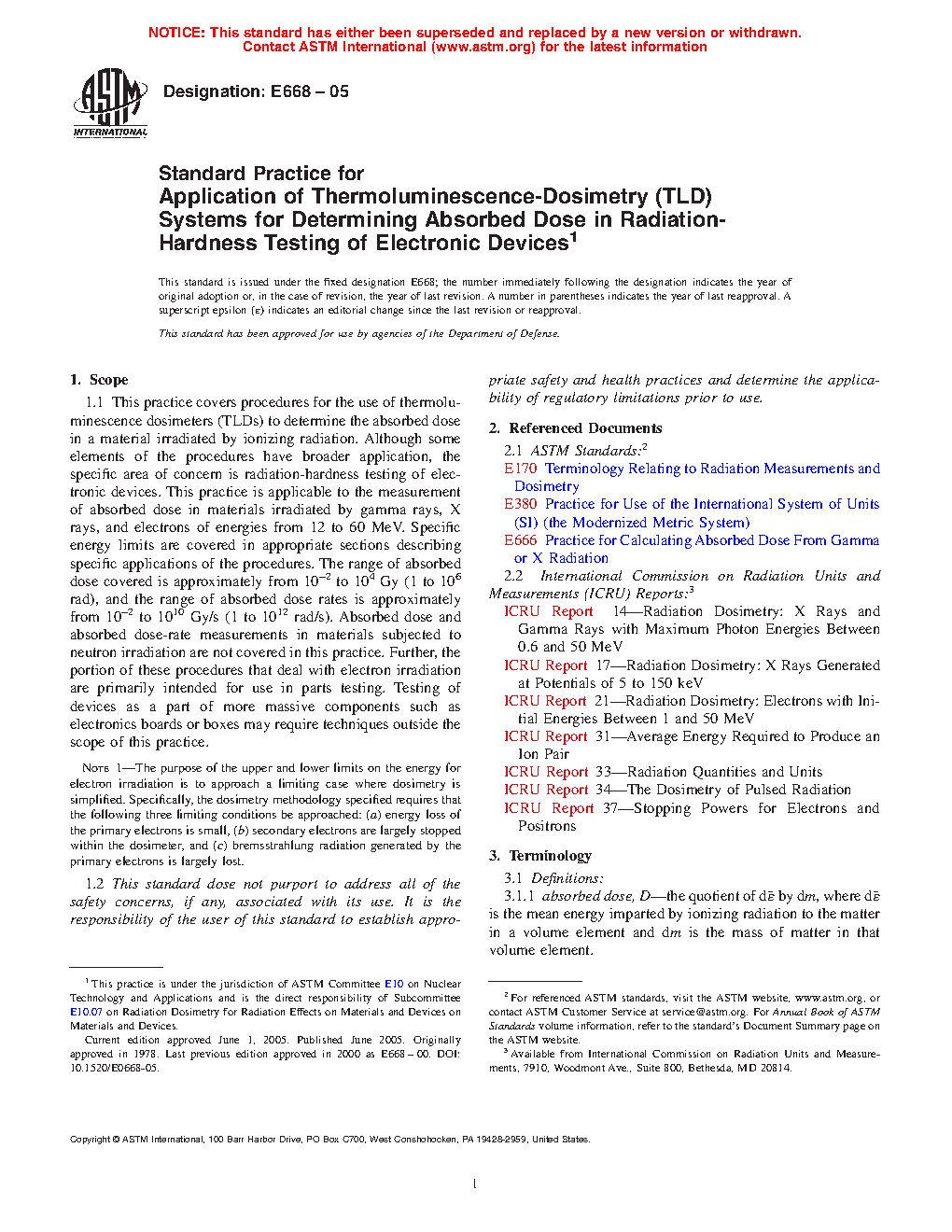 Note 2—For comprehensive discussions of various dosimetry methods applicable to the radiation types and energy and absorbed dose-rate range discussed in this practice, see ICRU Reports 14, 17, 21, and 34.